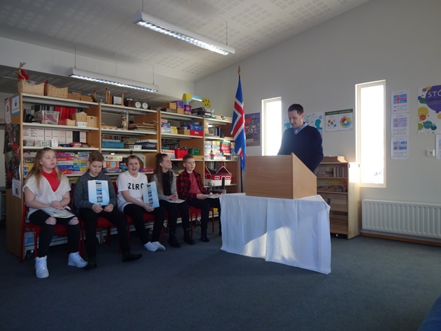 Skólastjórinn segir nokkur orð áður en nemendur lásu upp, að sjálfsögðu vandaði hann mál sitt og flutning.