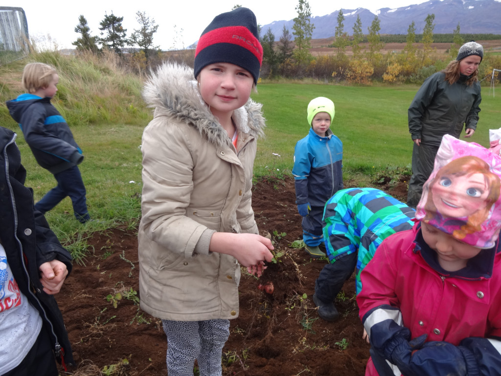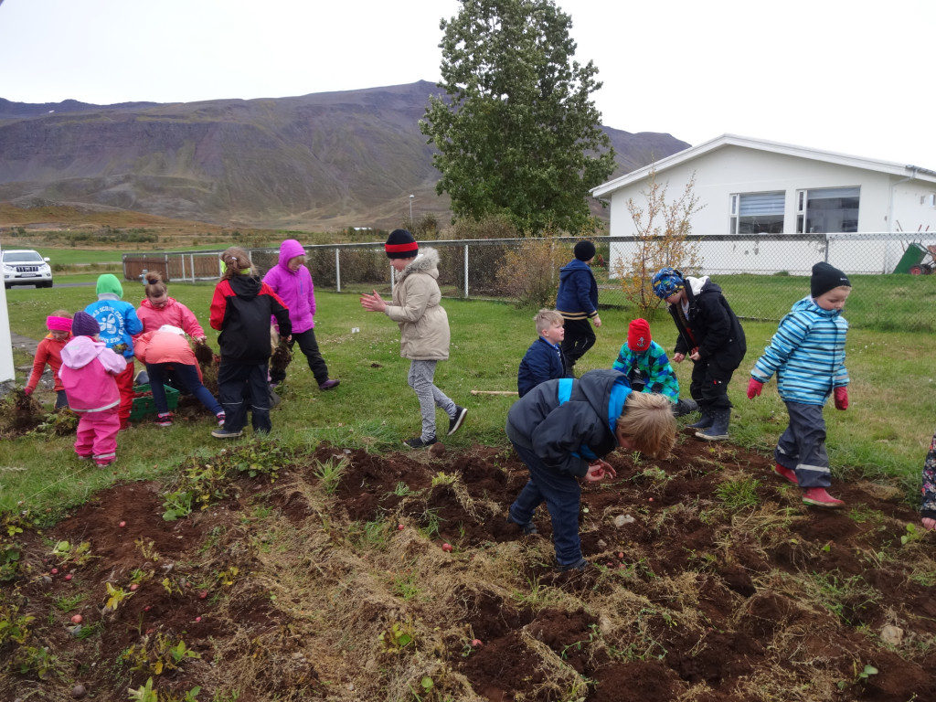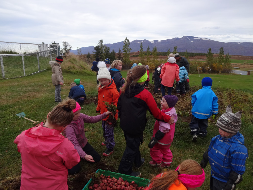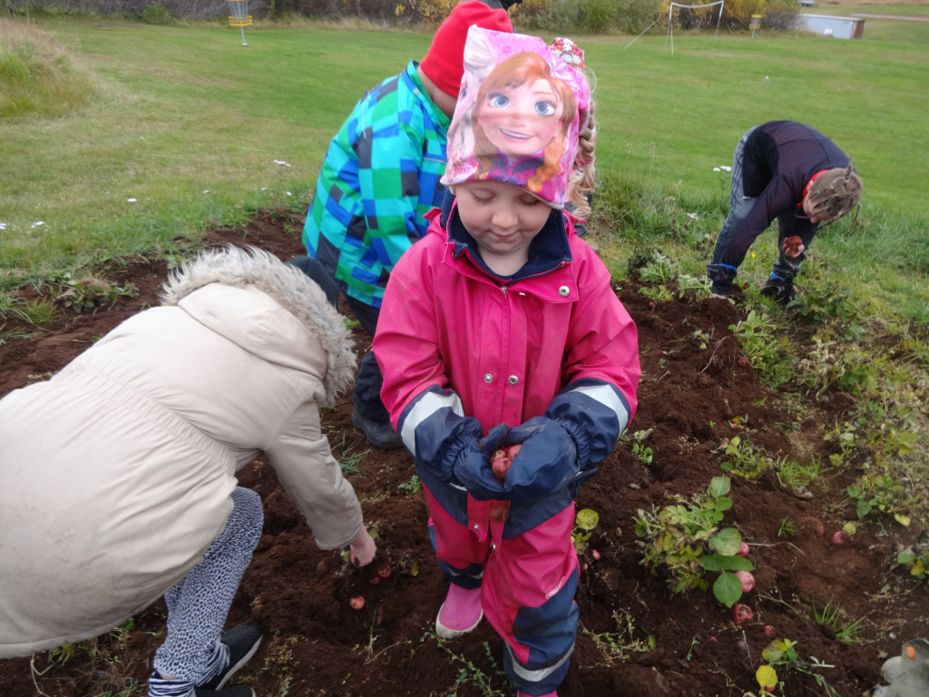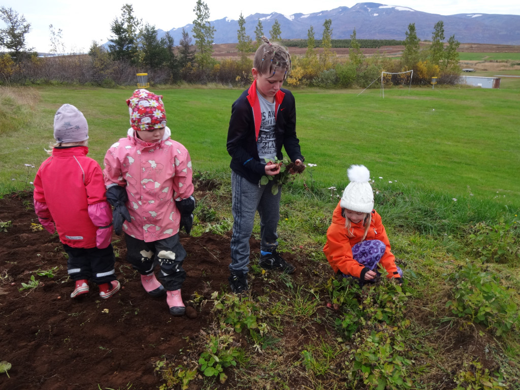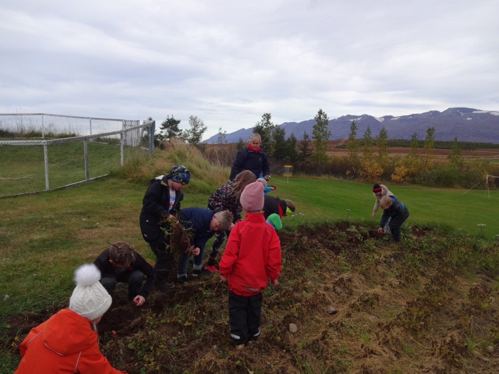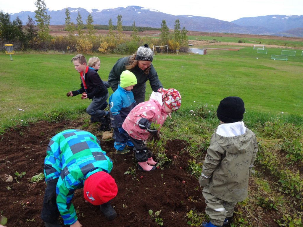 Veðrið leikur við okkur í Árskógi og tilvalið til útiverka. Í morgun fór 1.-5. bekkur ásamt Val umhverfisstjóra á Brimnesborgir þar sem 70 birkiplöntum var haganlega komið niður í jarðveginn. Þessi gróðursetning er árleg stund en plönturnar fáum við frá Yrkjusjóði sem er sjóður æskunnar til ræktunar landsins sem úthlutar grunnskólabörnum trjáplöntum til gróðursetningar. Eftir að hafa sett niður fórum við öll saman leik- og grunnskólastig í það að taka upp kartöflur. Uppskeran með ágætum og allir fengu poka með kartöflum heim. Já við erum græn og væn og erum mikið úti í fallegri náttúrunni.