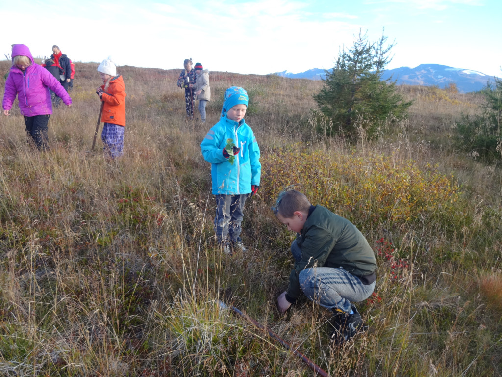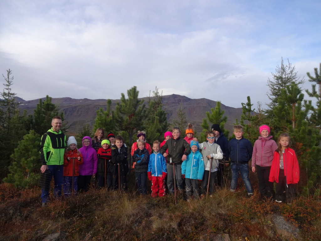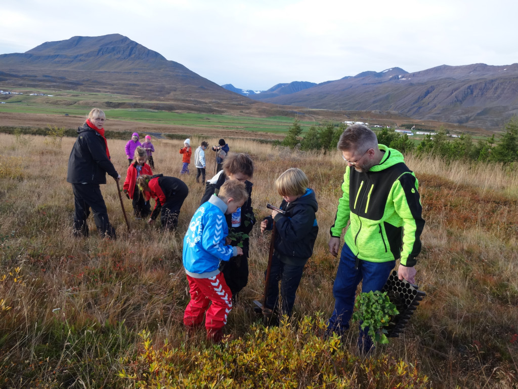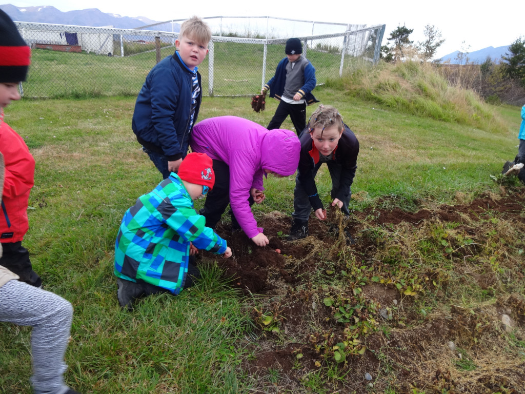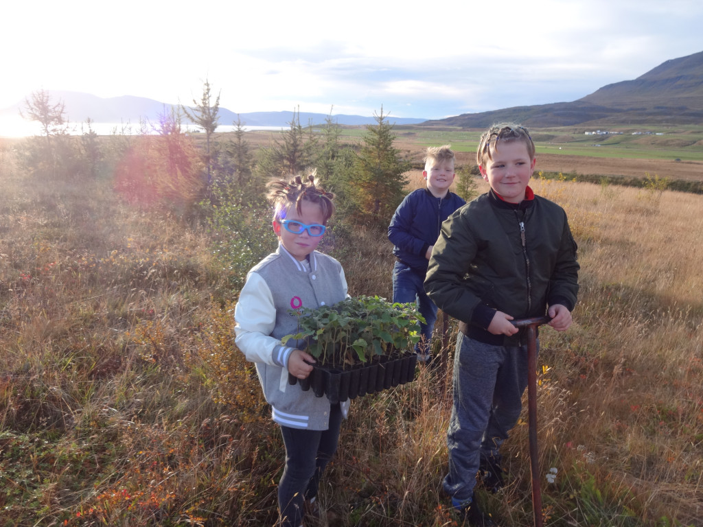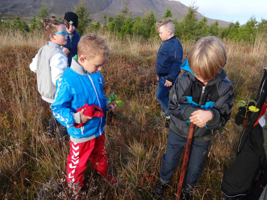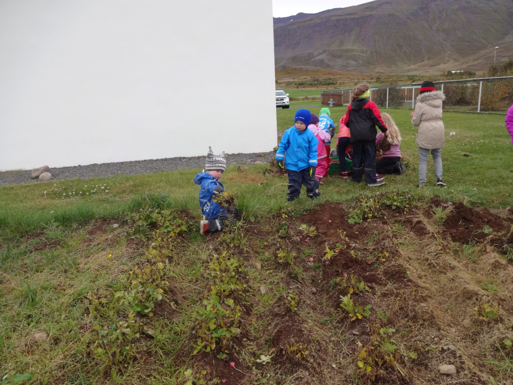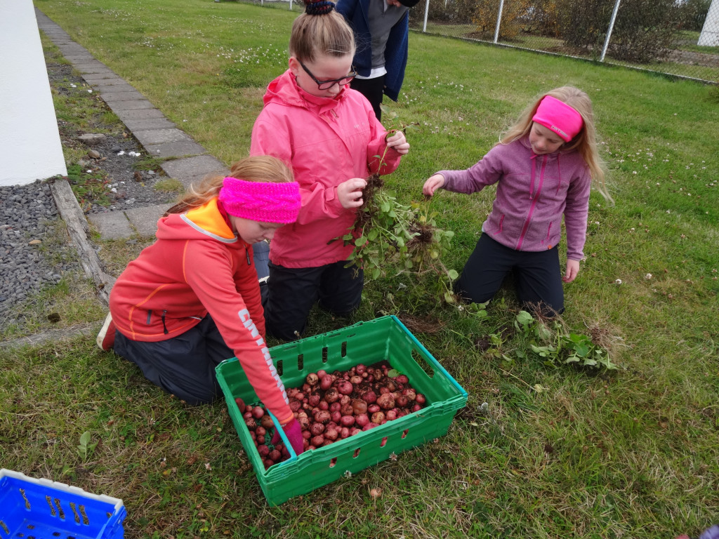 Veðrið leikur við okkur í Árskógi og tilvalið til útiverka. Í morgun fór 1.-5. bekkur ásamt Val umhverfisstjóra á Brimnesborgir þar sem 70 birkiplöntum var haganlega komið niður í jarðveginn. Þessi gróðursetning er árleg stund en plönturnar fáum við frá Yrkjusjóði sem er sjóður æskunnar til ræktunar landsins sem úthlutar grunnskólabörnum trjáplöntum til gróðursetningar. Eftir að hafa sett niður fórum við öll saman leik- og grunnskólastig í það að taka upp kartöflur. Uppskeran með ágætum og allir fengu poka með kartöflum heim. Já við erum græn og væn og erum mikið úti í fallegri náttúrunni.