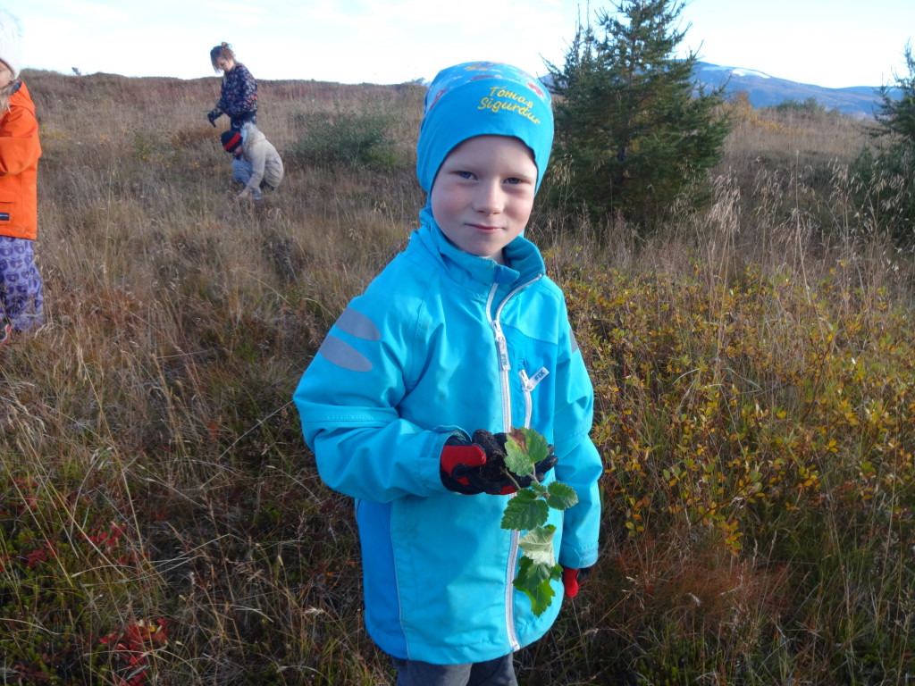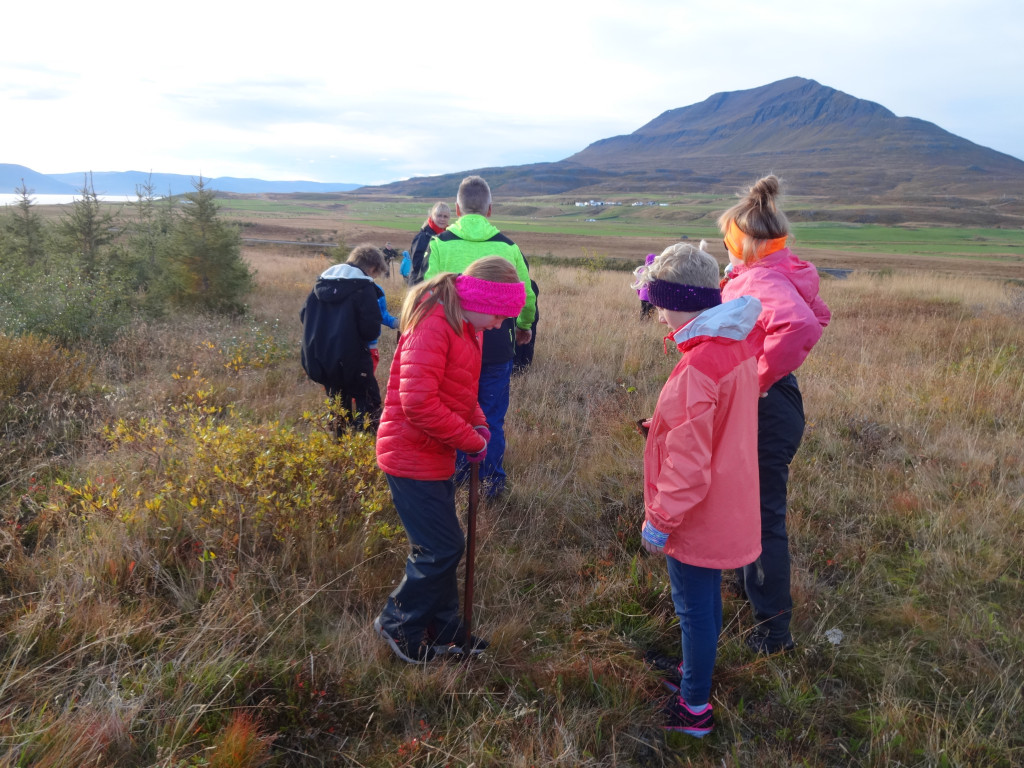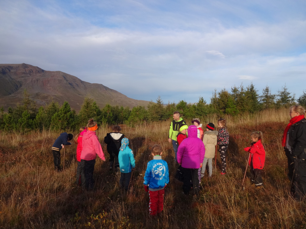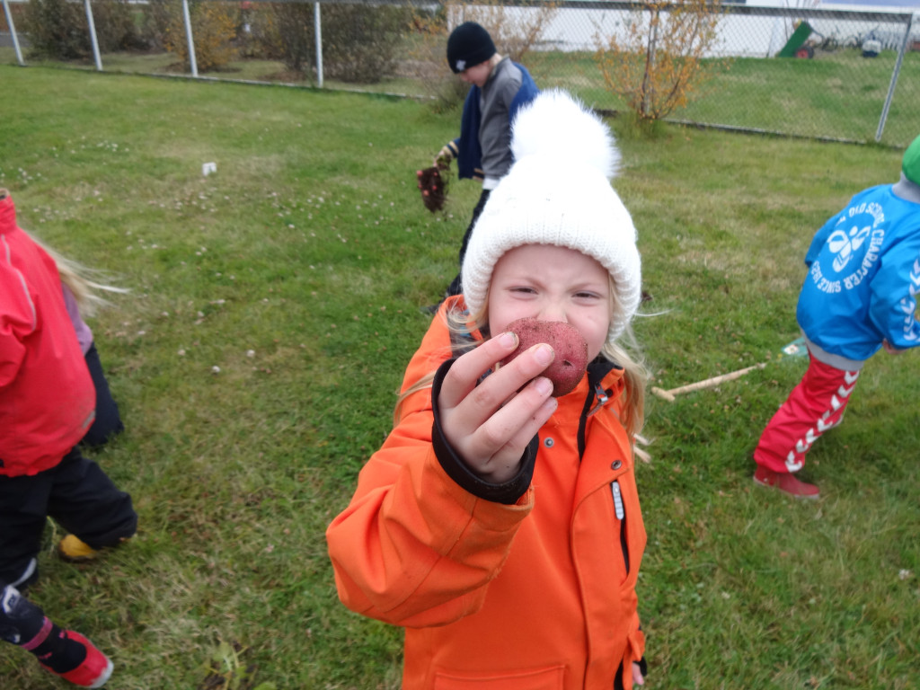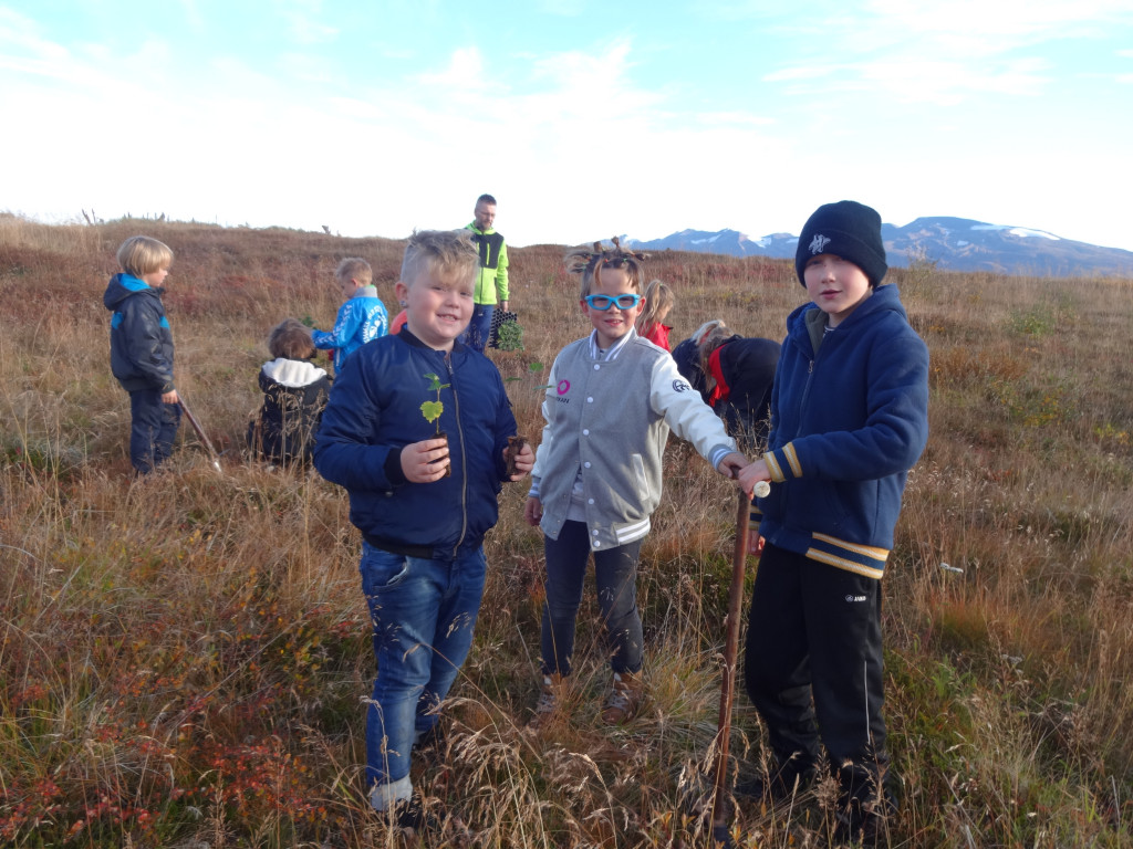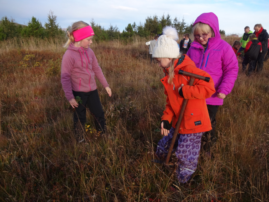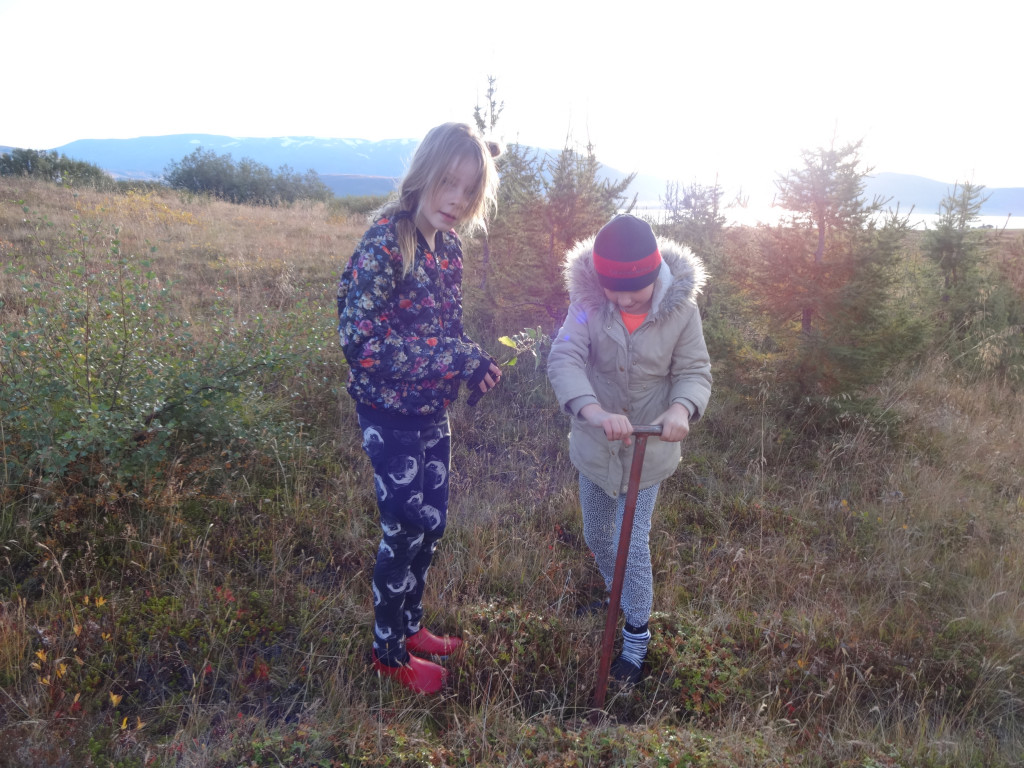 Veðrið leikur við okkur í Árskógi og tilvalið til útiverka. Í morgun fór 1.-5. bekkur ásamt Val umhverfisstjóra á Brimnesborgir þar sem 70 birkiplöntum var haganlega komið niður í jarðveginn. Þessi gróðursetning er árleg stund en plönturnar fáum við frá Yrkjusjóði sem er sjóður æskunnar til ræktunar landsins sem úthlutar grunnskólabörnum trjáplöntum til gróðursetningar. Eftir að hafa sett niður fórum við öll saman leik- og grunnskólastig í það að taka upp kartöflur. Uppskeran með ágætum og allir fengu poka með kartöflum heim. Já við erum græn og væn og erum mikið úti í fallegri náttúrunni.