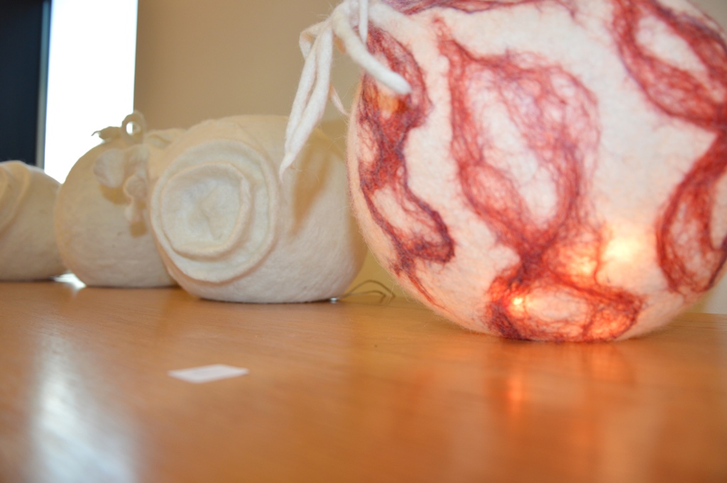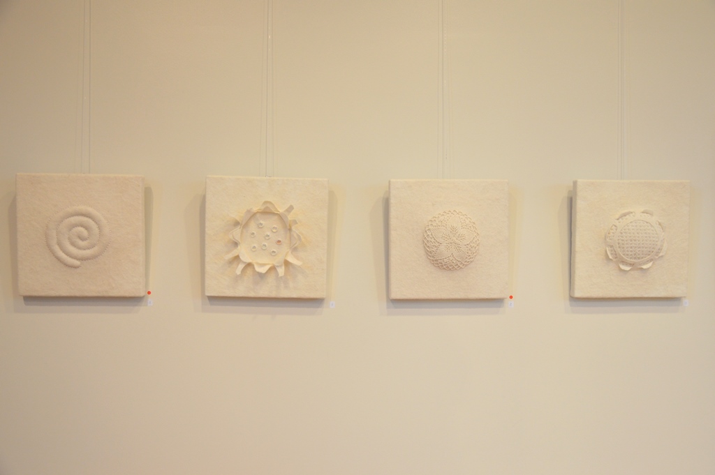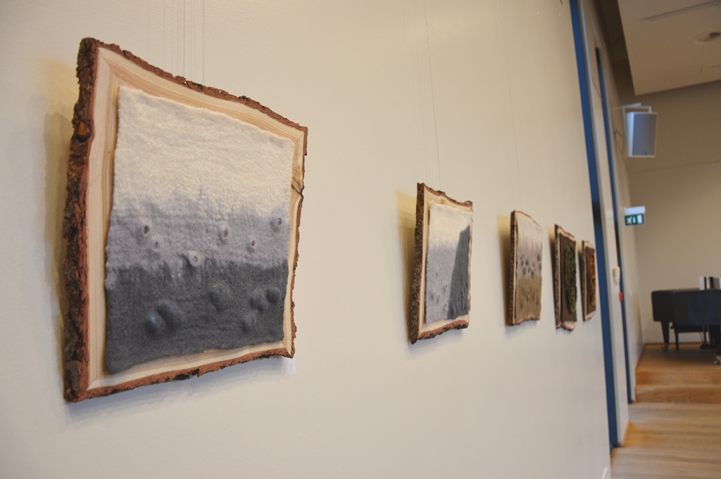 Í myndirnar notar hún ýmis efni með ullinni s.s. glerperlur, steina, silki, prjónaefni, grisjur og fl.