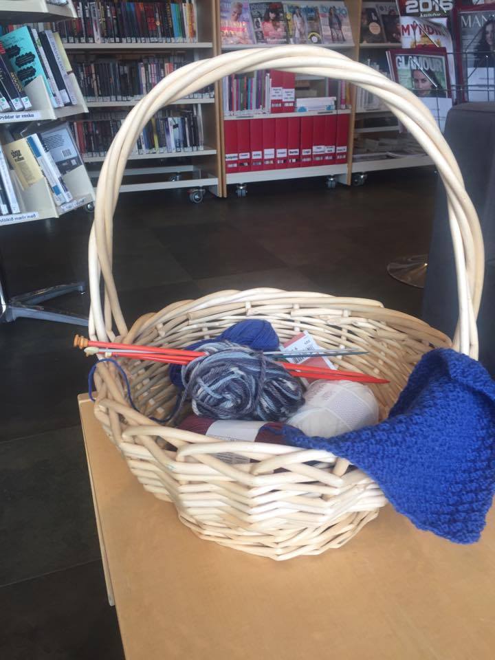 Við höfum nú komið fyrir körfu í setkrók bókasafnsins þar sem komnir eru nokkrir garnhnyklar sem hægt er að grípa í. Við erum enn að óska eftir svokölluðum afgöngum eða garni sem fólk hyggst ekki sjálft nýta. Allt garn sem er gefið er sett í þessa körfu, ásamt prjónum, og hugsunin er að fólk geti sest, prjónað nokkrar umferðir (nú eða heilt stykki) og úr verði allskonar lítil prjónastykki. Þessi stykki hyggjumst við svo flétta saman svo úr verði teppi. Þetta teppi mætti þá kalla hálfgert samvinnuteppi þar sem allir bæjarbúar fá tækifæri til að setja sína lykkju á verkið.