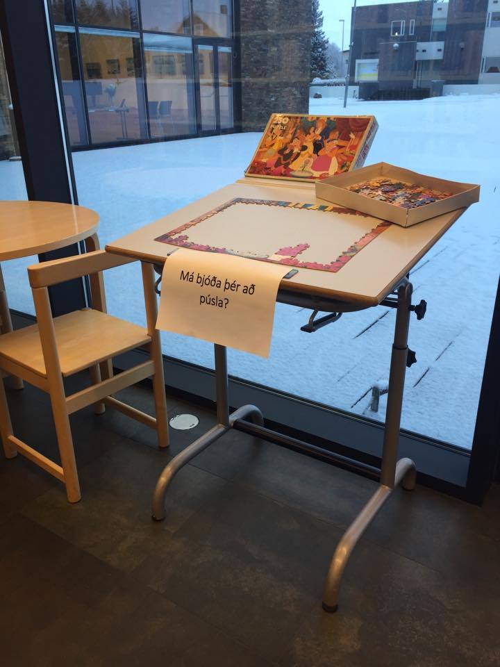 Við höfum auk þess komið upp borði og púsli og bjóðum þar gestum og gangandi að glíma við púsl af ólíku erfiðleikstigi. Við á bókasafninu viljum endilega gera það sem við getum til að skapa eftirsóknavert andrúmsloft sem er rólegt og nærandi og er púslið einn liður í því að skapa slíkt umhverfi.