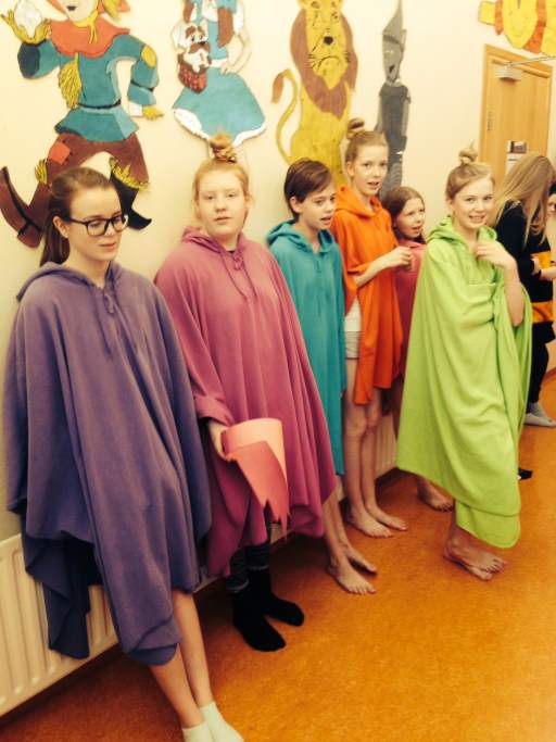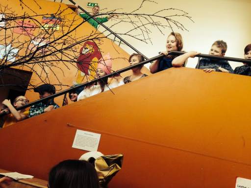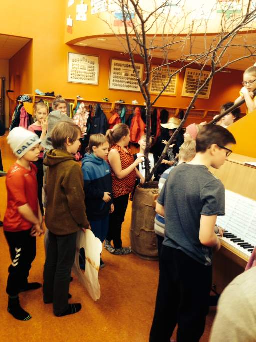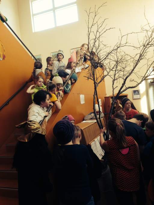 Æfingar fyrir árshátíðina standa nú yfir og er óhætt að segja að mikil spenna sé í húsinu. Á myndunum má meðal annars sjá 5. - 7. bekk sem bíða þolinmóð á ganginum eftir því að komast á svið. Til að létta biðina hóf Styrmir leik á píanóið og krakkarnir tóku að sjálfsögðu undir. Söngurinn ómaði um allann skólann og verður gaman að sjá afrakstur æfinga hja þessum hæfileikaríku og skapandi krökkum í næstu viku.