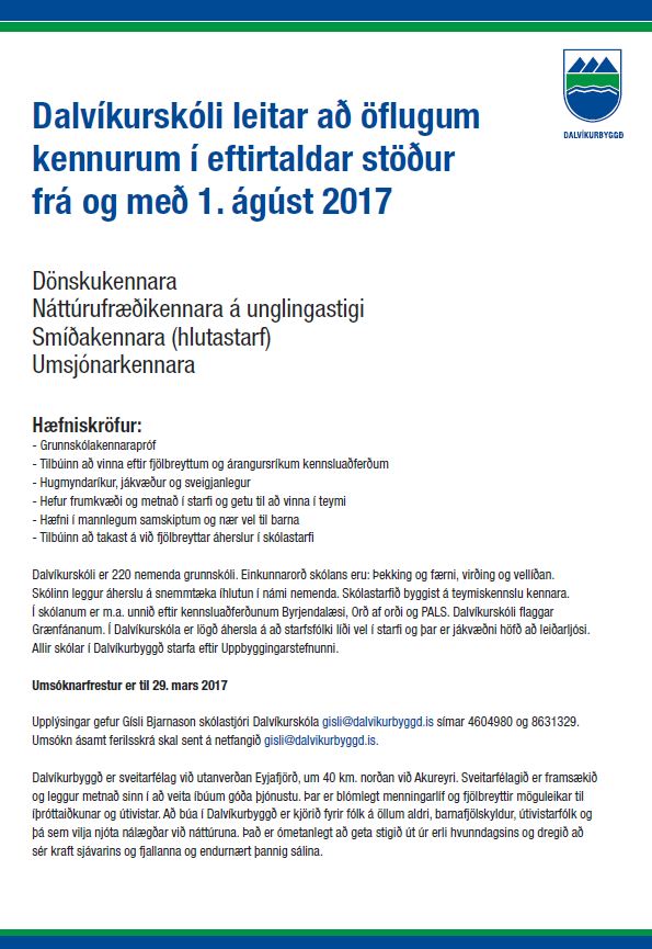 Við Mímisveg | 620 Dalvík Sími á skrifstofu: 460 4980 Netfang: ritari@dalvikurbyggd.is |