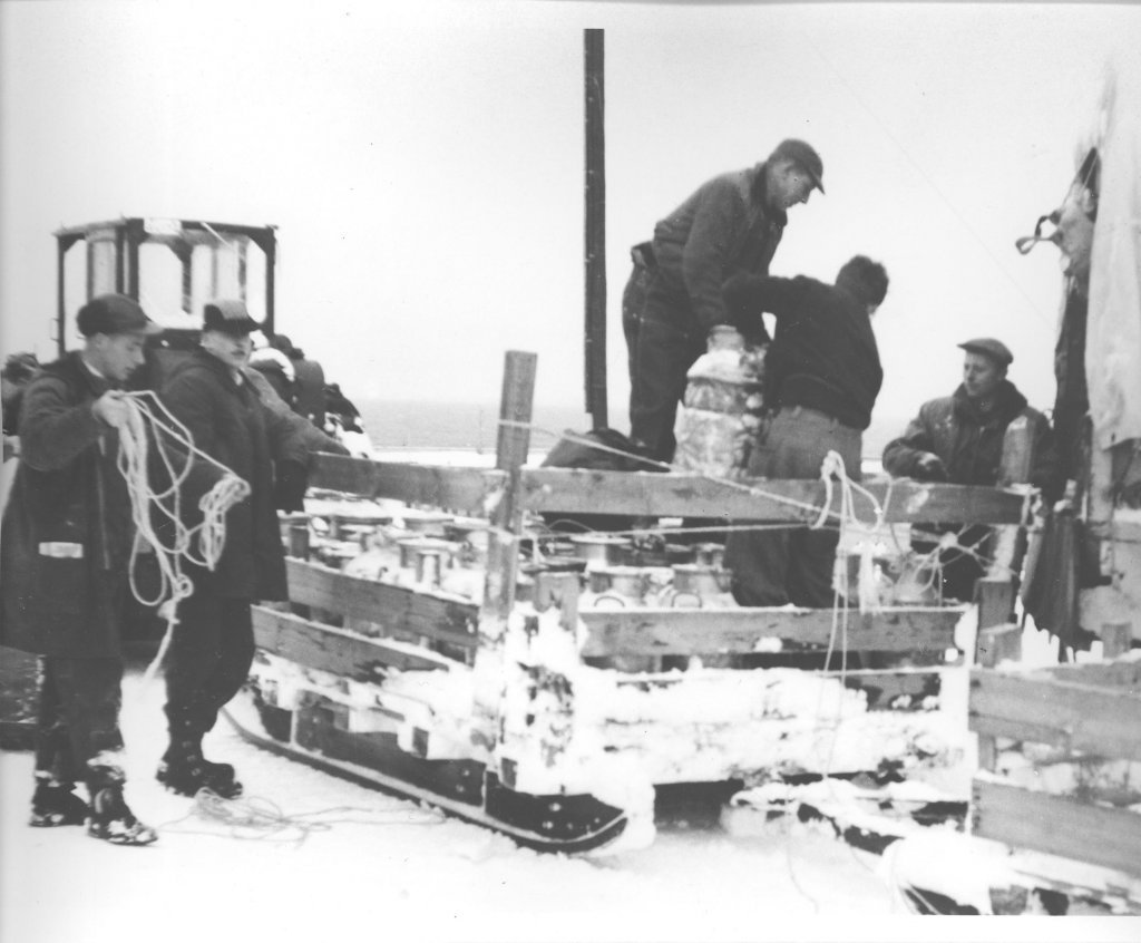 Mjólkin komin með ýtu úr sveitinni og er hér færð yfir á bíla á Dalvík. F.v. Gunnlaugur Sigvaldason (ýtustjóri)