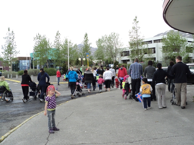 Í morgun fórum við í skrúðgöngu með Krílakoti, við sungum fallega í Samkaup, fyrir framan ráðhúsið og á Dalbæ. Allir skemmtu sér ljómandi vel og veifuðu íslenska fánanum.