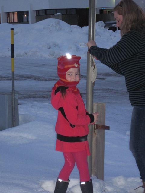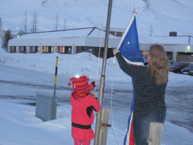 Í dag er Arna Dögg 5 ára. Af því tilefni bjó hún til glæsilega kórónu sem hún bar í dag, flaggaði íslenska fánanum, var þjónn í hádeginu og svo var afmælissöngurinn að sjálfsögðu sunginn fyrir hana. Við óskum Örnu Dögg og fjölskyldu hennar innilega til hamingju með daginn.