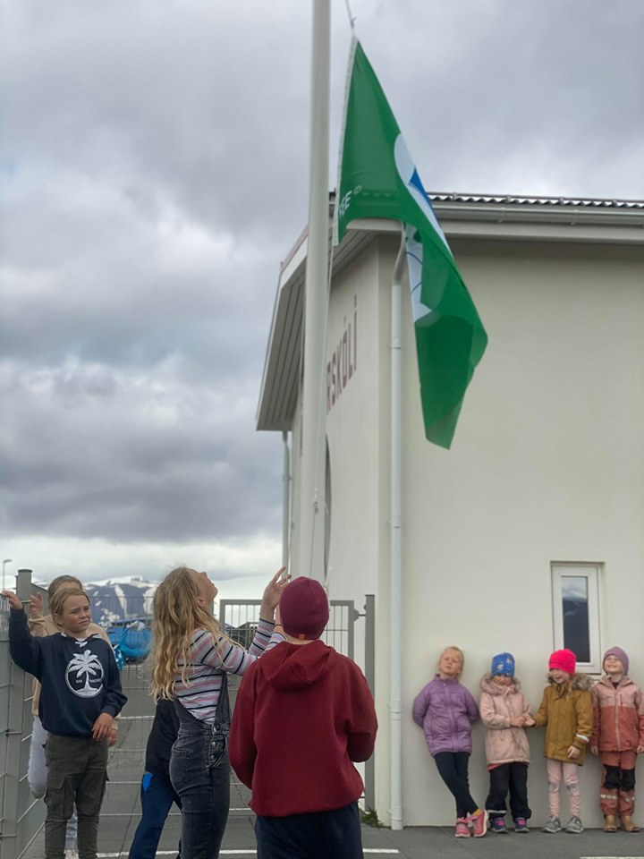 Hér fyrir neðan má sjá nokkrar myndir frá afhendingunni en Katrín Sigurjónsdóttir, sveitarstjóri, veitti fánann fyrir hönd Landverndar og voru það nemendur í 7. bekk sem tóku á móti fánanum og flögguðu honum fyrir hönd skólans.