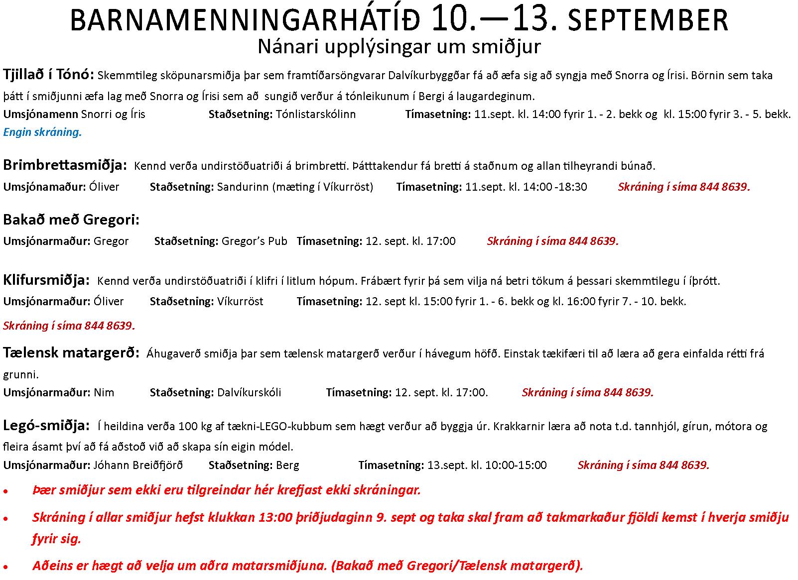 Frítt er í allar smiðjur og viðburði en athugið að í sumar smiðjurnar þarf að skrá börnin. Skráning hefst þriðjudaginn 9. september kl. 13:00 og taka skal fram að takmarkaður fjöldi kemst í hverja smiðju.