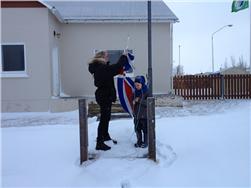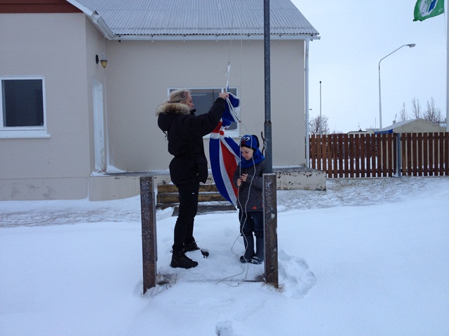 Þegar komið var heim á leikskólann á ný bauð Bjarki síðan börnunum upp á ávexti og flaggaði íslenska fánanum í tilefni dagsins í dæmigerðri íslenskri vetrar veðráttu
