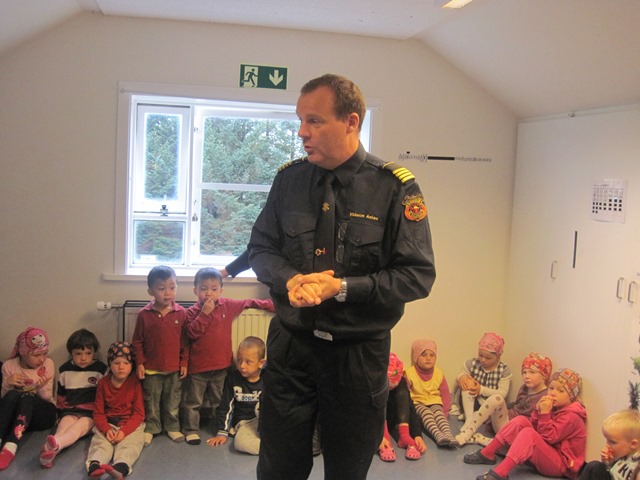 Í dag höfðum við brunaæfingu í leikskólanum. Fyrst ræddu kennararnir við börnin um æfinguna og svo kom Villi slökkviliðsstjóri til okkar og spjallaði við börnin. Æfingin gekk mjög vel og börnin voru svo dugleg að fara út þegar bjallan fór í gang. Emmi prófaði svo að fara niður brunastigann framan á húsinu þegar allir voru komnir út og allir horfðu á.