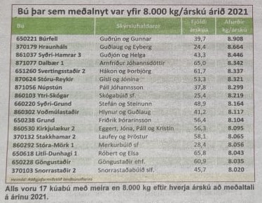 Annað árið í röð reyndist mest meðalnyt eftir árskú vera hjá þeim Guðrúnu Marinósdóttur og Gunnari Þór Þórissyni á Búrfelli í Svarfaðardal. Þar endaði nyt eftir árskú í 8.908 kg. á árinu 2021!