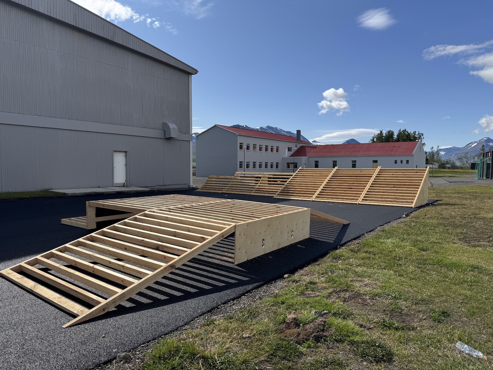 Á skólalóðinni er svo verið að smíða rampa og braut fyrir hjólabretti, hjól og hlaupahjól. Búið er að malbika og er smíðavinna í fullum gangi og það verður spennandi að sjá hvernig "parkið" kemur út þegar það er full klárað, það er Eiríkur Helgason hjólabretta frumkvöðull sem hannaði og er að smíða nýja parkið, en hann hefur hannað og smíðað slík pörk út um allt land.