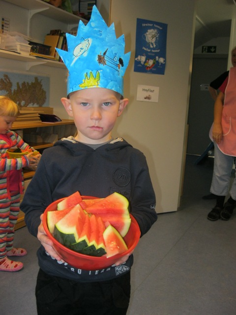 Á sunnudaginn, 9. október, verður Fannar Ingi 5 ára. Af því tilefni hélt hann upp á afmælið sitt í leikskólanum í dag. Hann bjó sér til myndarlega kórónu, flaggaði íslenska fánanum, bauð upp á ávexti í ávaxtastund og var svo þjónn í hádeginu. Börn og kennarar sáu svo um að syngja fyrir hann afmælissönginn. Við óskum Fannari Inga og fjölskyldu hans innilega til hamingju með daginn.