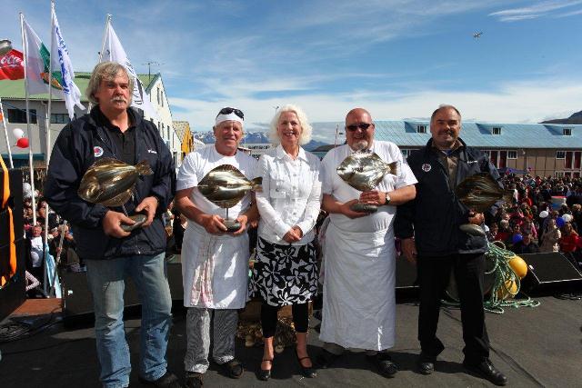viðurkenningar fyrir framlag - og frábær störf í þágu dagsins. Sem fulltrúa allra þeirra sjálfboðaliða sem komið hafa að Fiskideginum mikla voru fjórir aðilar kallaðir til, þeir hafa verið með frá upphafi og aldrei dregið af sér. Úlfar Eysteinsson yfirkokkur, Arnþór Sigurðsson aðstoðarkokkur, Skarphéðinn Ásbjörnsson fiskisýningarstjóri og Auðunn Stefnisson alt mulig maður. Þeim voru veittir veglegir gripir sem Jóhannes Hafsteinsson hannaði og smíðaði að vanda. Þess má geta að alla viðurkenningargripi Fiskidagsins mikla frá upphafi hefur Jóhannes smíðað, hannað og gefið Fiskideginum mikla.
