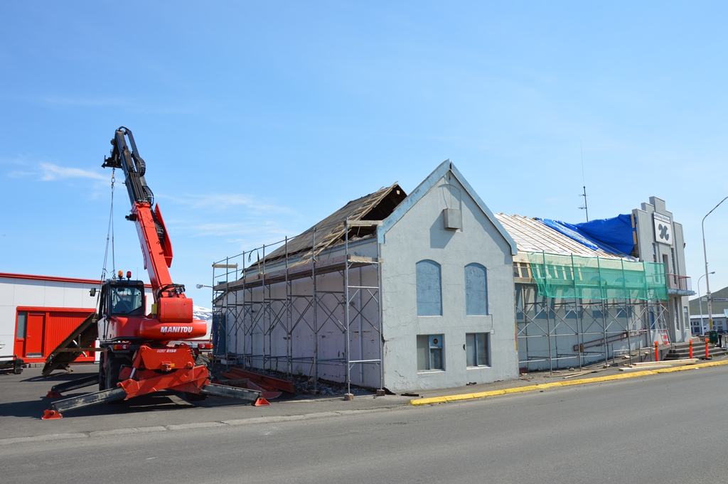 Nú standa yfir framkvæmdir við Ungó, en það er á þriggja ára áætlun sveitarfélagsins að endurgera húsið að utan.