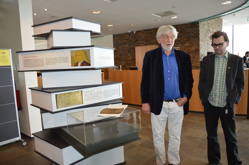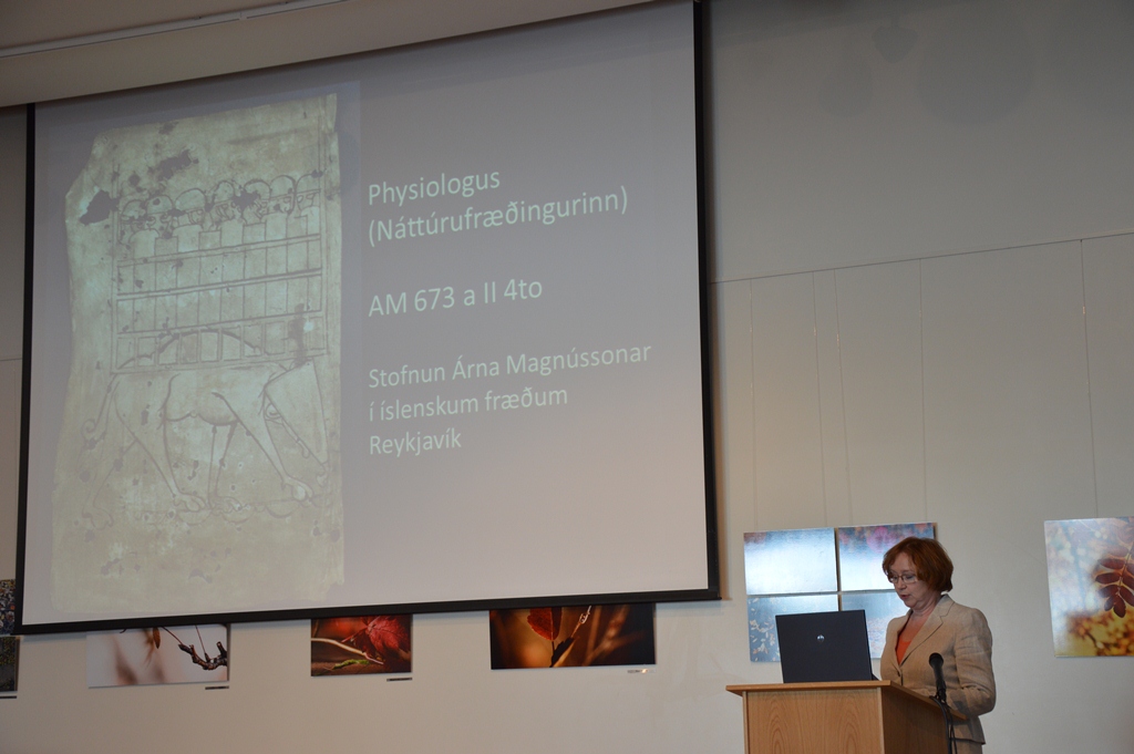 Á sýningunni í Bergi verður sýnd nákvæm eftirgerð blaða úr skinnhandriti frá um 1200 sem geyma afar fornan texta. Þetta er íslensk þýðing úr latínu á riti sem upphaflega var ritað á grísku á 2. öld e.Kr. Þar er fjallað um ýmsar skepnur og einkenni þeirra lögð út á guðfræðilegan hátt. Handritið er ekki síst merkilegt fyrir myndir sem sýna dýrin og eru áreiðanlega með elstu teikningum sem varðveist hafa á Íslandi. Handritið kom til Árna Magnússonar frá séra Þórði Oddssyni á Völlum í Svarfaðardal.