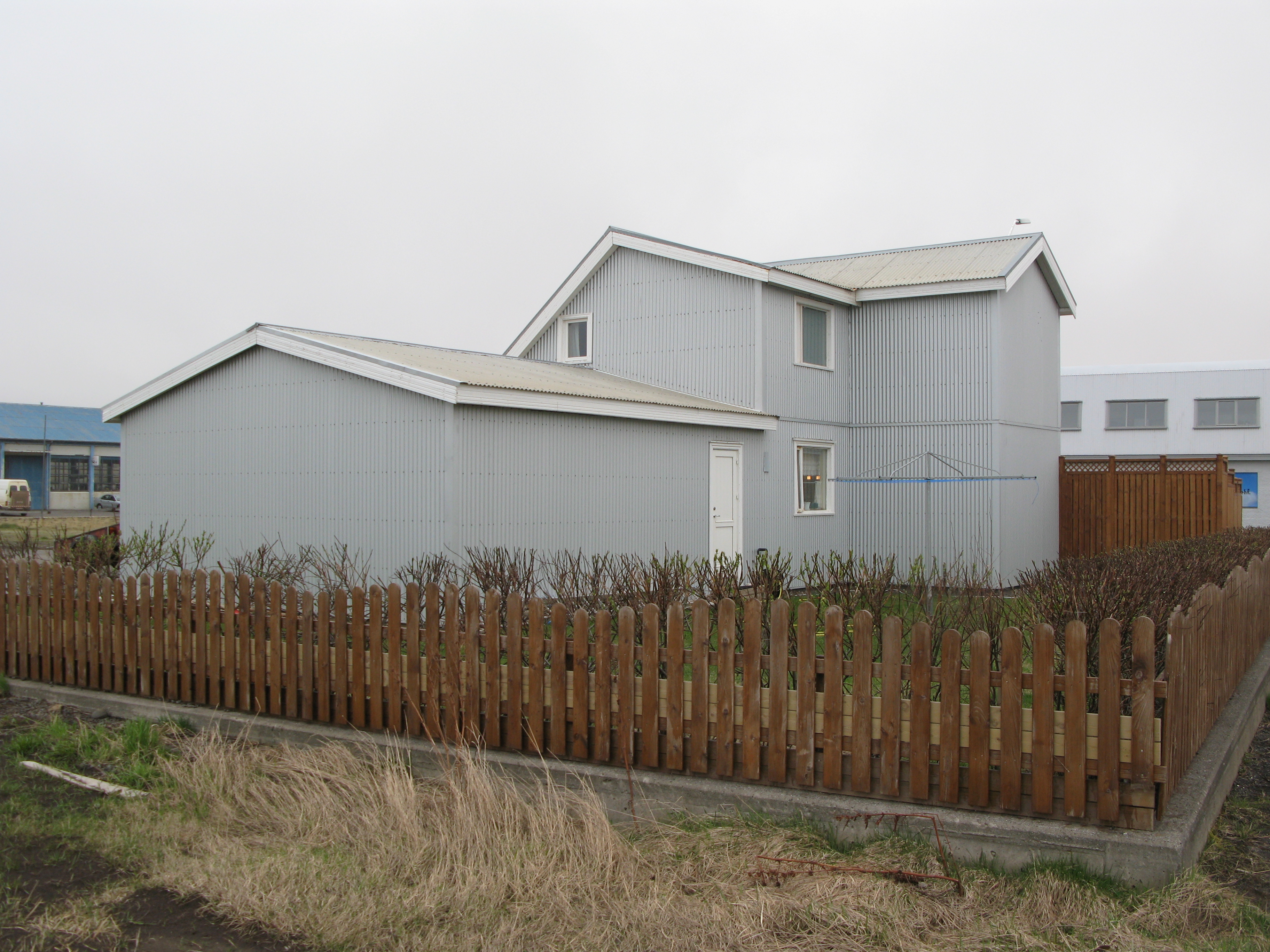 ( l: 9,5 – b: 5,7 – h: 6,2) Timburhús á steinsteyptum grunni. Ein hæð, port og ris m/kvisti. Hæðinni skipt m/timburskilrúmi í tvö geymsluherbergi. Lofthæð skipt m/timburskilrúmum í fimm herbergi. Útbygging: ( l: 3,1 – b: 2,9 – h: 6,2) Úr sama efni.
