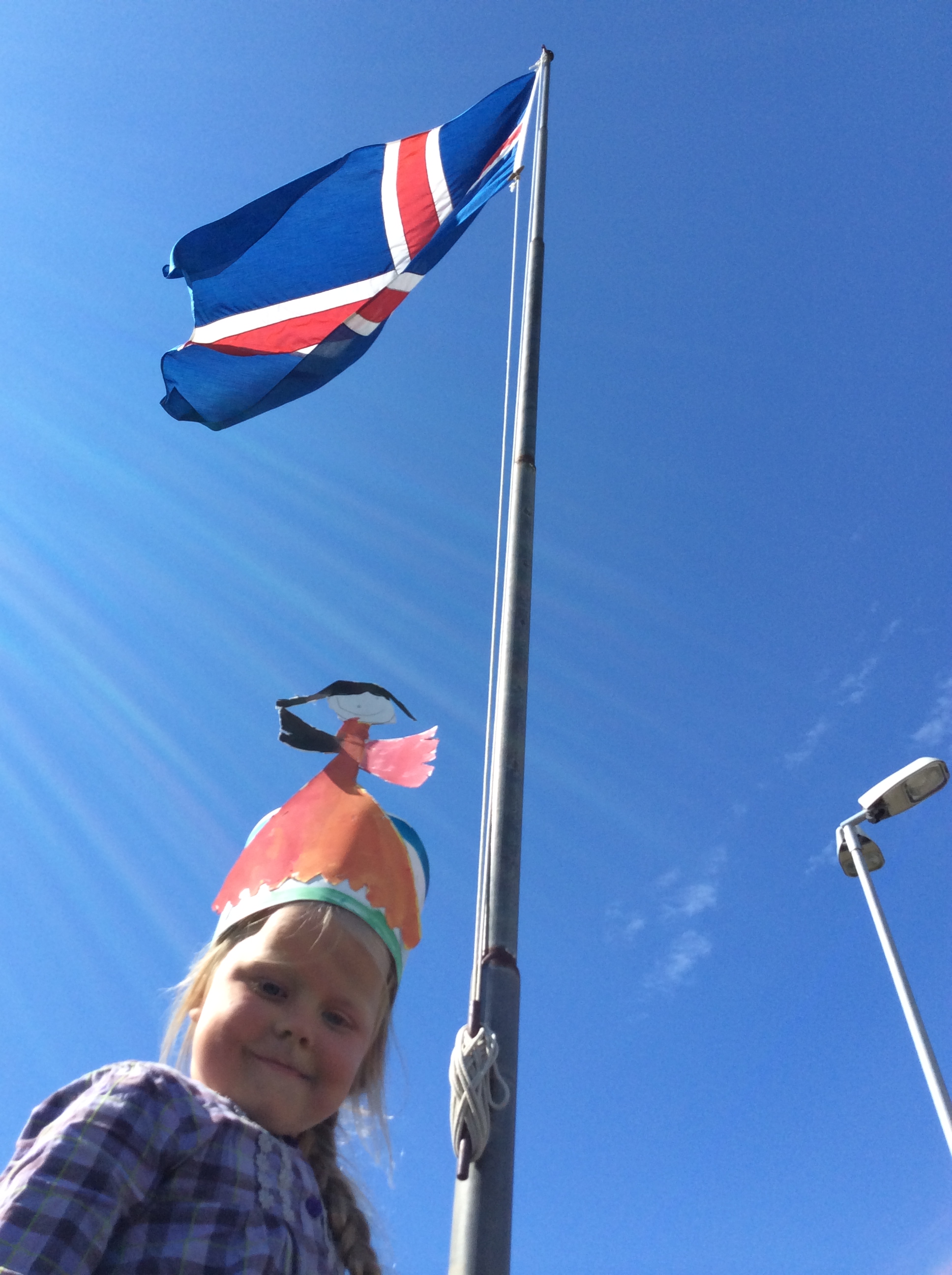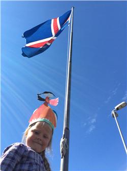 og sunginn var afmælisöngurinn fyrir hana. Síðan fór hún út og flaggaði íslenska fánanum.