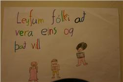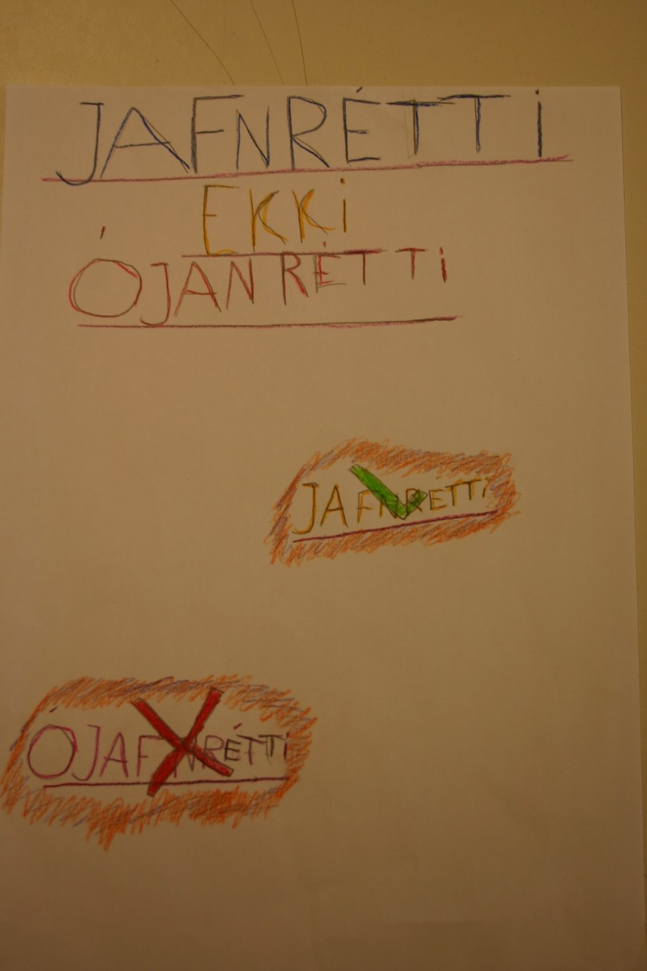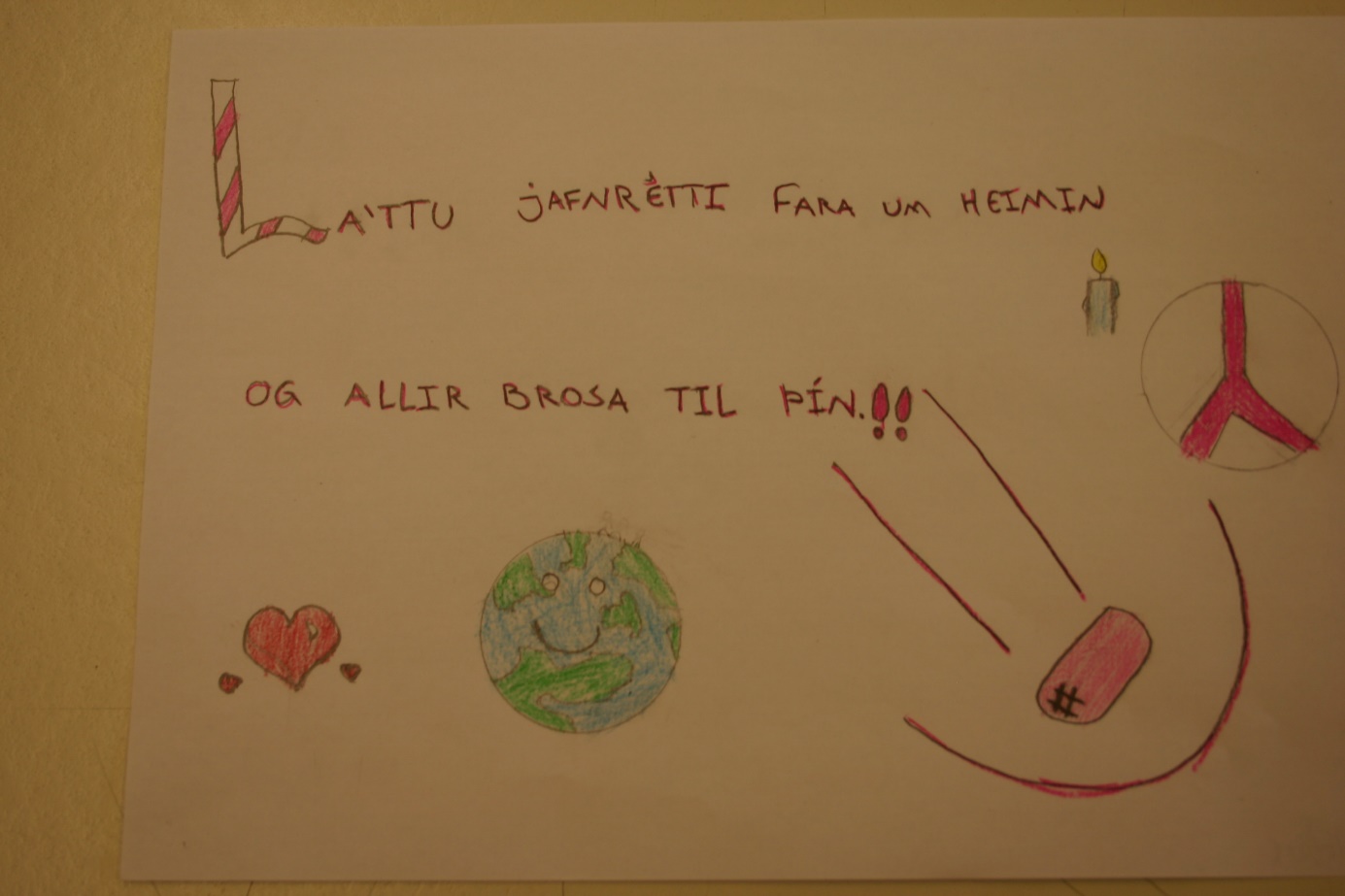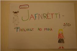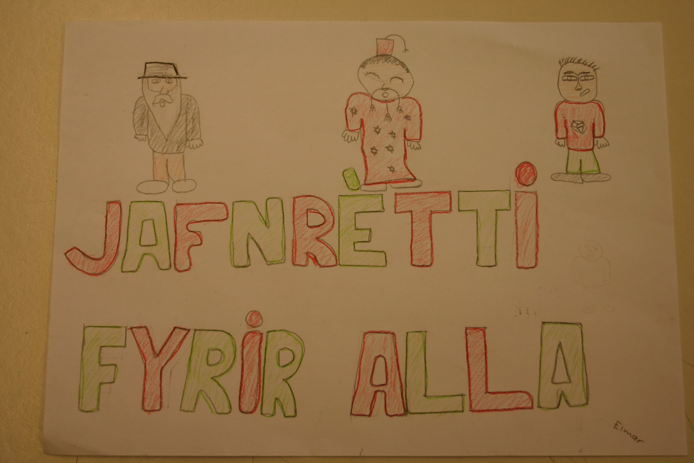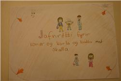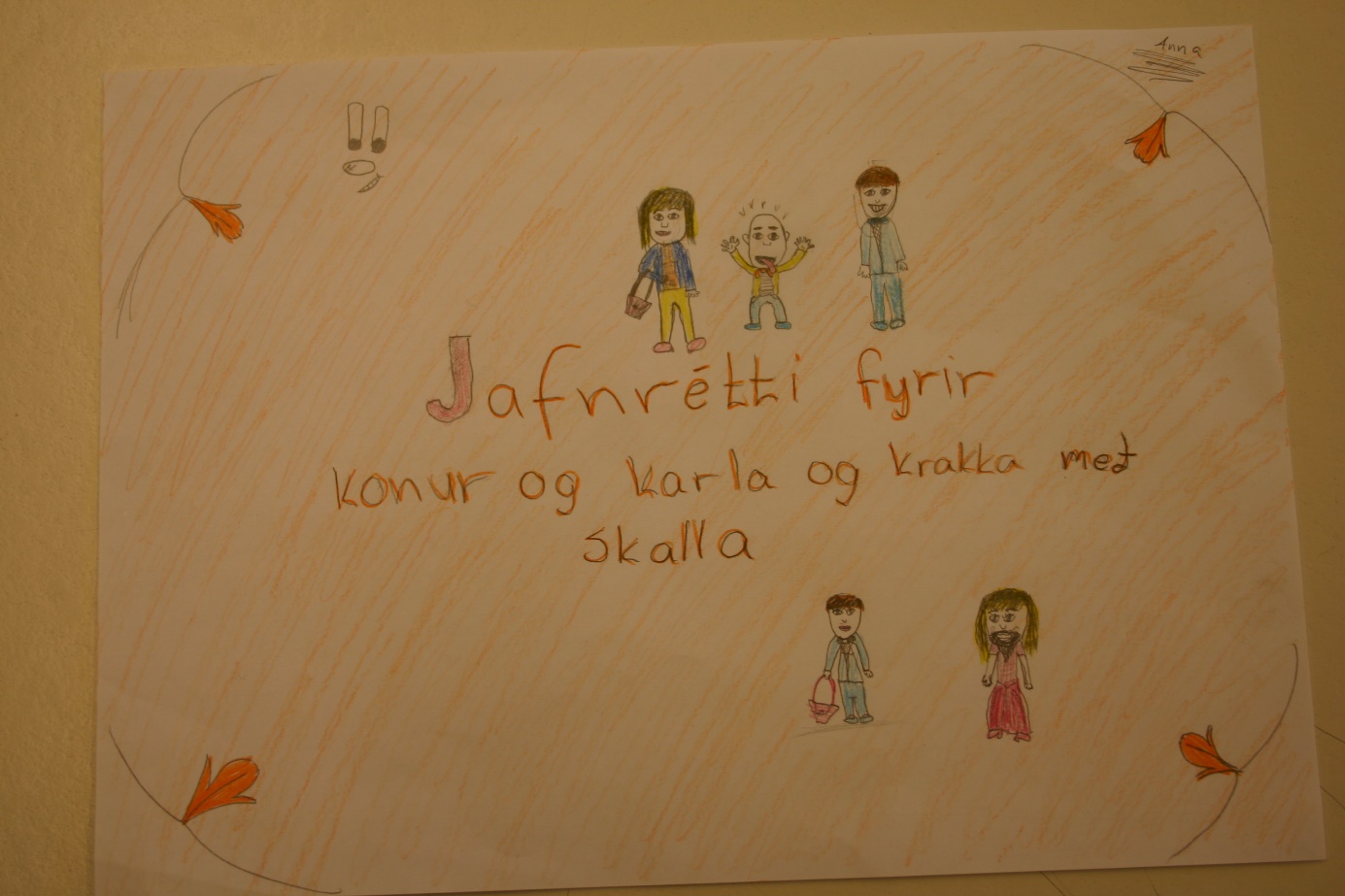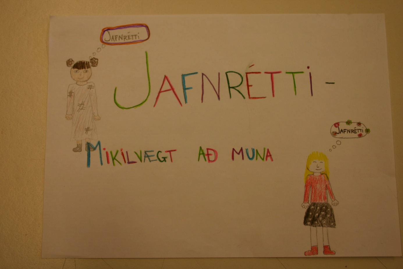 Nemendur 5. bekkjar gerðu veggspjöld með jafnréttisslagorðum. Til að byrja með hjálpuðust allir við að safna saman hugmyndum að slagorðum og svo útbjó hver nemandi veggspjald með einu slagorði og myndskreytti það. Mörg flott veggspjöld urðu til við þessa vinnu og prýða nokkur þeirra einmitt þessa grein.