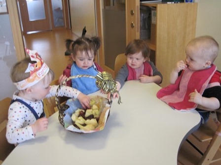 Eftir sönginn fengu allir sér ávexti úr ávaxtakörfunni.