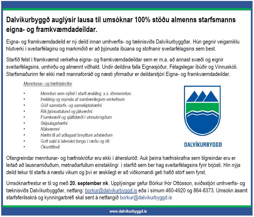 Dalvíkurbyggð auglýsir eftir starfsmanni á nýja eigna- og framkvæmdadeild. Umsóknarfrestur er til og með 20. september.