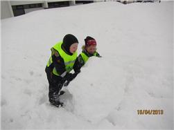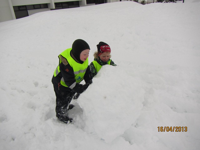 Á skipulagi útikennslu gærdagsins hjá Mánabörnum var að rölta upp í skógarreit, fylgjast með því hvernig snjórinn smám saman tæki sig upp og umhverfi skógarins breyttist við það. Einnig ætluðum við að skima eftir því hvort að það væri ekki alveg örugglega eitthvað sem myndi benda okkur á að vorið væri á næsta leyti, líkt og fuglasöngur, tré að springa út eða jafnvel eitthvað líf að kveikna í jörðu og fleira. En þó að maður geri plön er ekki þar með sagt að þau gangi alltaf upp. Í gær gékk planið okkar ekki aldeilis upp enda allt á kafi í snjó ennþá og enn hafi bæst í snjóinn um nóttina. Skyndilega þaut vorhugurinn algjörlega framhjá okkur og við ákváðum að halda áfram að gleðjast yfir öllu því snjómagni og þeim möguleikum sem það hefur haft upp á að bjóða í vetur og notuðum hugmyndaflugið í að byggja stór glæsileg snjókarlahjú á lóð ráðhússins sem fengu nöfnin Snæfinnur og Snæfinna. Leyfum myndunum að tala sýnu máli!
