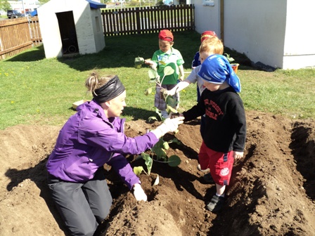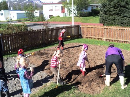 Í gær settu börnin niður í matjurtargarðinn okkar, það vakti mikla gleði og kátínu og nú hlakkar okkur til að sjá afraksturinn í haust. Settar voru meðal annars niður kartöflur, graslaukur og ýmiskonar kál ásamt jarðaberjum.  Vonandi fær garðurinn okkar að vera óáreittur í sumar.