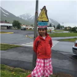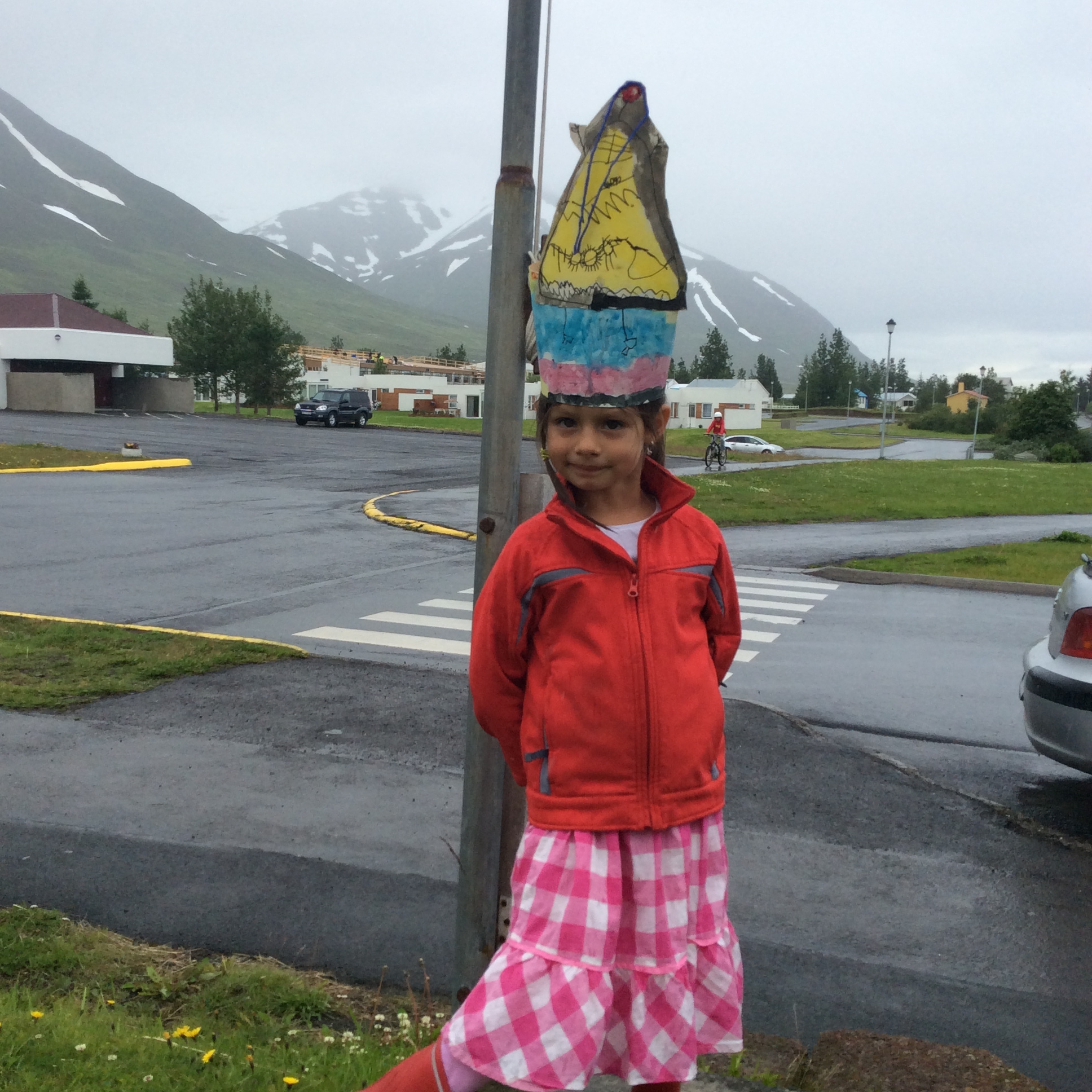 og sunginn var afmælisöngurinn fyrir hana. Síðan fór hún út og flaggaði íslenska fánanum.