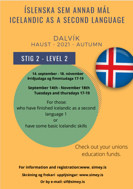 Nú í september fer af stað námskeið á stigi 2 í íslensku sem annað mál. Námskeiðið er haldið á þriðjudögum og fimmtudögum á milli 17-19 frá 14. september og til 18. nóvember.