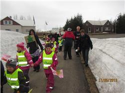 Í dag var öllum foreldrum boðið að koma og vera stund með barninu sínu í leikskólanum. Búið var að hengja upp verk og skráningar af vetrarvinnu barnanna sem foreldrar gátu skoðað og um 11:00 leytið var lagt af stað í skrúðgöngu. Hver hópur var búinn að búa til sinn einkennisfána en svo bjó hvert barn til sinn eigin fána sem það bar í skrúðgöngunni. Þeir foreldrar sem komu með fengu það hlutverk að spila á trommur og hristur á leiðinni undir söng barnanna. Við stoppuðum hjá ráðhúsinu og sungum euróvisjónlagið hans Eyþórs Inga fyrir bæjarstjórann og aðra gangadi vegfarendur. Þá héldum við áfram í búðina þar sem lagið var aftur tekið fyrir viðskiptavini og starfsfólk þar. Var okkur alls staðar vel tekið. Við vorum líka svo heppin að hitta Sylvíu, mömmu hans Orra Sæs sem var með lítið, krúttlegt og nýfætt lamb í bala. Við fengum öll að skoða það, klappa og knúsa og sjá þegar það drakk mjólkina úr pelanum sínum sem Sylvía gaf því. Erfitt var fyrir suma að slíta sig frá lambinu en við þurftum að drífa okkur aftur í leikskólann til að borða hádegismatinn. Þar var öllum boðið upp á grillaðar pylsur í hádeginu, foreldrafélagið bauð foreldrum en leikskólinn sá um börnin. Við vorum heppin með veður, pínu kalt en nánast logn og það hvorki rigndi né snjóaði og þrátt fyrir snjóskafla og smá sand og drullu í garðinum áttum við yndislegan dag úti við. Eurovisjónlögin ómuðu í tækinu og allir í svo góðu skapi
