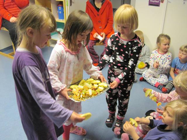Í dag héldum við sameiginlega afmælisveislu fyrir börnin sem áttu afmæli í október og nóvember hjá okkur. Þetta var heldur betur fjöldi því 2 börn áttu afmæli í október, þau Bryndís Lalita og Matthías Helgi og svo voru þau hvorki fleiri né færri en 9 sem áttu afmæli núna í nóvember. En það eru Lilja Rós, Hildur Inga, Pálmi Þór, Þorri Jón, Kristján Sölvi, Jóhanna Fönn, Heiðrún Elísa, Víóla Mjöll og Orri Freyr. Börnin buðu að venju upp á ávaxtaspjót sem búið var að gera fyrir þau. Við óskum öllum þessu börnum innilega til hamingju. Í dag var einnig náttfatadagur eins og sjá má á myndunum.