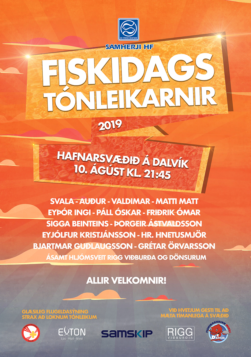 Fiskidagstónleikarnir 2019 verða haldnir sem fyrr við hafnarsvæðið á Dalvík 10. ágúst nk. Hljómsveit Rigg viðburða leikur undir hjá þjóðþekktum söngvurum sem flytja sín vinsælustu lög í útsetningum Ingvars Alfreðssonar. Gestgjafar eru sem fyrr heimamennirnir Friðrik Ómar, Eyþór Ingi og Matt Matt.