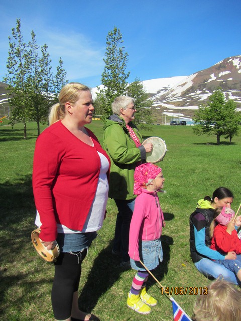 Þá lá leiðin á Dalbæ þar sem bæði heimilisfólkið og starfólk gaf sér einnig tíma í að koma út, tilla sér í sólskininu og hlusta á okkur syngja