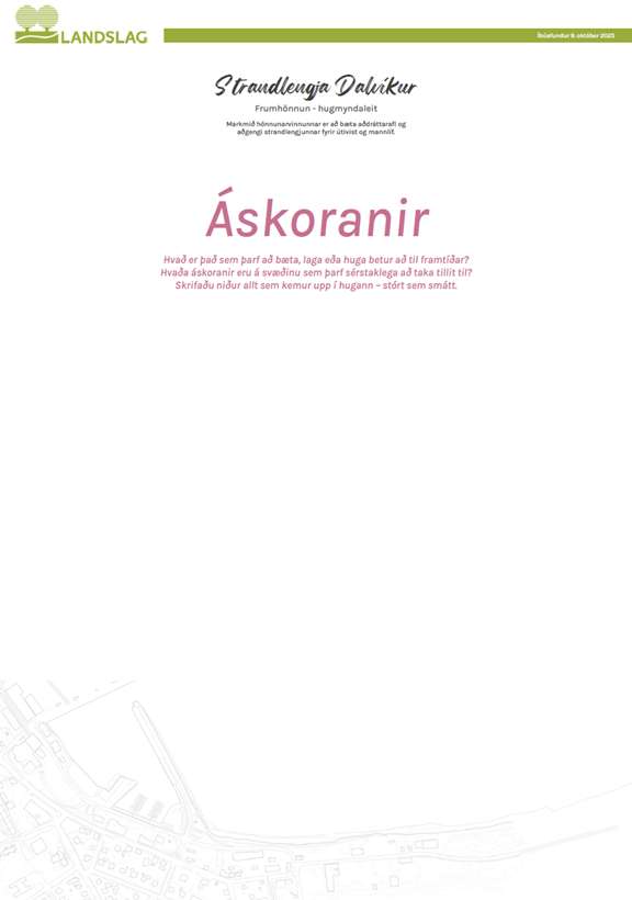 Við hvetjum íbúa til þess að rita hugmyndir og skila inn öllu sem ykkur dettur í hug varðandi strandlengjuna, hægt er að skila inn hugmyndum nafnlaust.