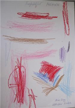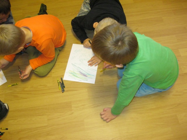 Börnunum var svo skipt í 5 hópa og hver hópur fékk eitt stórt karton og slatta af litum og þau teiknuðu á blöðin öll hljóðin sem þau heyrðu.