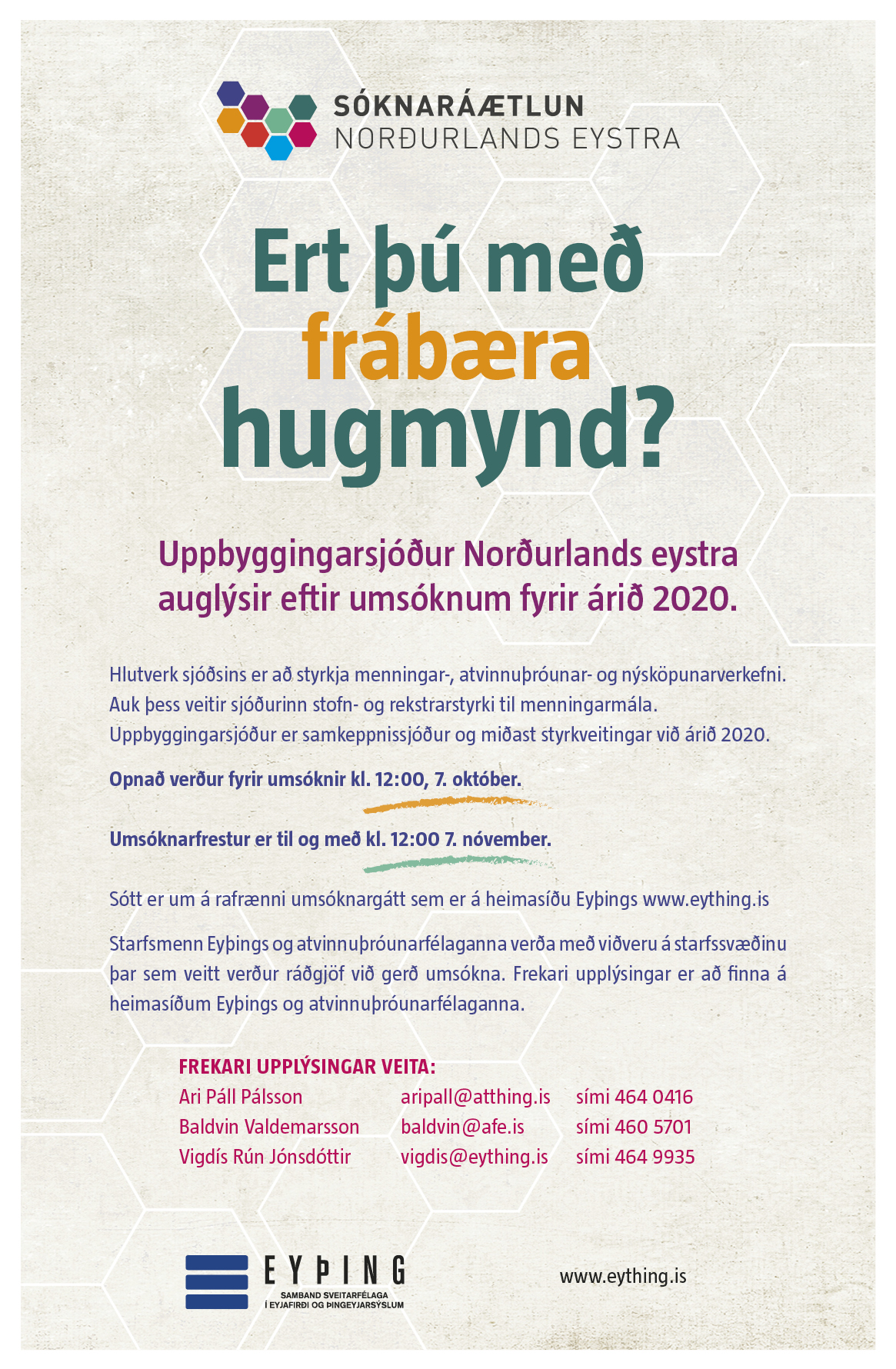 Uppbyggingarsjóður Norðurlands eystra auglýsir eftir umsóknum fyrir árið 2020. Hlutverk sjóðsins er að styrkja menningar-, atvinnuþróunar- og nýsköpunarverkefni. Umsóknarfrestur er til og með 7. nóvember kl. 12.00.