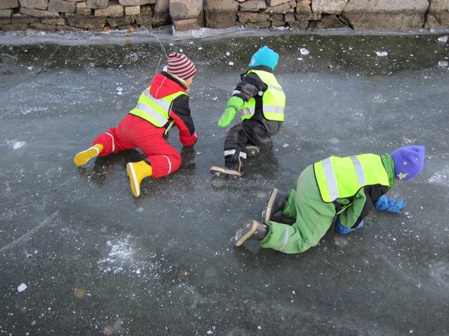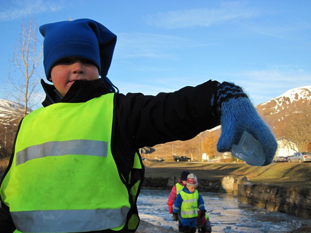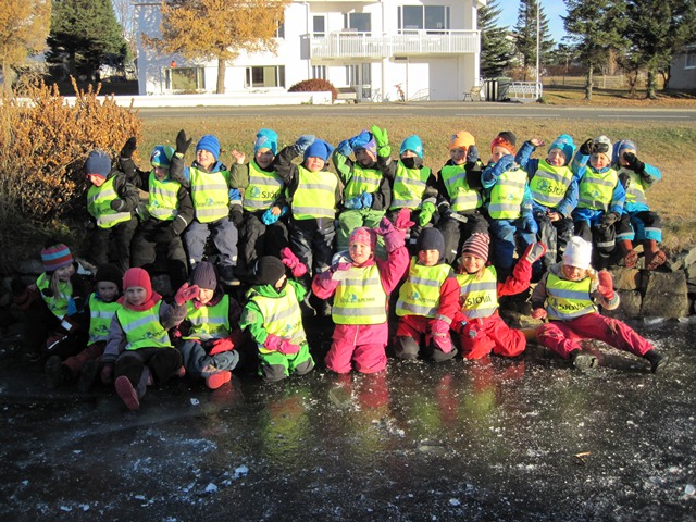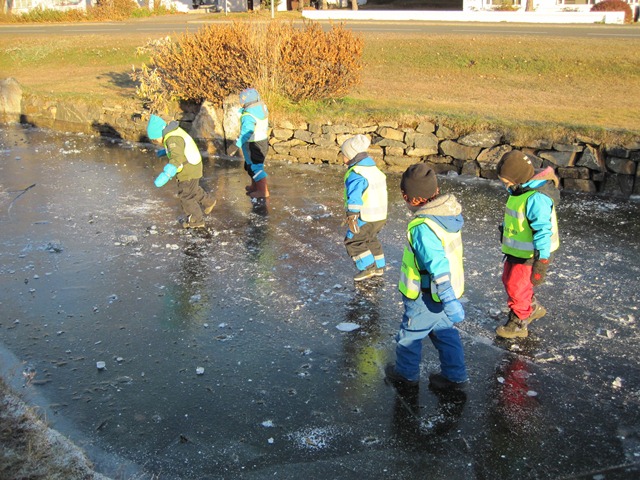 Í gær mánudaginn 22. október var útikennsla hjá okkur á Mánakoti. Við nýttum kennslu dagsins í að fræða börnin um frost og fjölbreytileika þess. Við röltum að láginni (tjörninni við Byggðasafnið) þar sem tjörnin var alveg botnfrosin. Börnin fengu að fara út á klakann sem vakti að vanda mikla lukku, sumir nýttu hana sem skautasvell, aðrir fóru í rannsóknarvinnu þar sem þeir lágu á klakanum og skildu ekkert í því hvernig það sem oní var hefði getað fest þar og enn aðrir duttu í ýmisskonar leik. Sumir brutu sig niðrí vatn og flest allir smökkuðu á klakanum