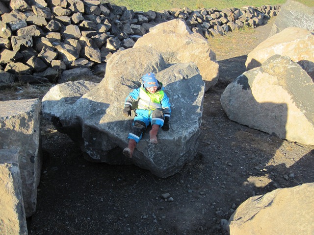 Hjá einu barninu festist stór klakaköggull á ullarvettlingnum sem vakti mikla furðu og athygli hinna barnanna. Að öllu þessu grúski loknu héldum við niðrað sjó þar sem mikil umræða varð um það hvort að sjórinn væri ekki alveg örugglega frosinn líka. Þegar þangað var komið sást enginn klaki og var mikið velt því fyrir sér hversvegna svo væri ekki. Börnunum var gerð grein fyrir ástæðu þess og þegar heim var komið var skellt í eina tilraun þar sem vatn var sett í tvær hálfslítersflöskur. Í aðra þeirra var svo blandað salti eins og er í sjónum og átti nóttin í nótt að skera úr um það hvort að myndi frjósa í báðum flöskunum eða ekki? Lítið bar á frosti í nótt og því verður tilraunin og niðurstaða hennar að bíða þangað til frost á sér stað. Endað var á því að leyfa börnunum að spreyta sig í klifri á stórum grjóthnullungum sem prýða svæðið við ferjuhöfnina þessa stundina og fannst þeim það ekki leiðinlegt. Leyfum myndunum að tala sínu máli. Fleiri myndir af deginum má sjá á myndasíðu!