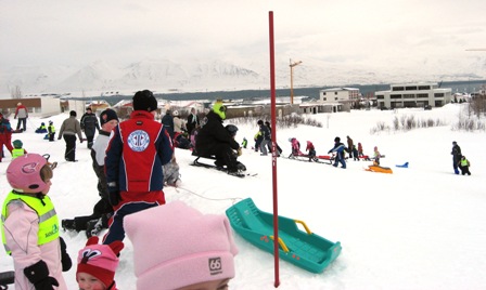 Í dag voru vetrarleikar Krílakots og Fagrahvamms í kirkjubrekkunni. Kjöraðstæður voru til að renna sér bunu á snjóþotu og sleða. Snjótroðari Skíðafélagsins hafði farið ferð um brekkuna og gert hana slétta og fína. 5 bekkur Dalvíkurskóla kom í heimsókn og aðstoðaði og skemmti sér með krökkunum. Hilmar Guðmundsson setti leikana fyrir hönd bæjarstjórnar. Hilmar fór einnig fyrstu ferðina og setti tóninn fyrir skemmtilega stund í kirkjubrekkunni þar sem leikskólakrakkar, starfsfólk leikskólanna, foreldrar og 5. bekkur Dalvíkurskóla skemmtu sér saman.