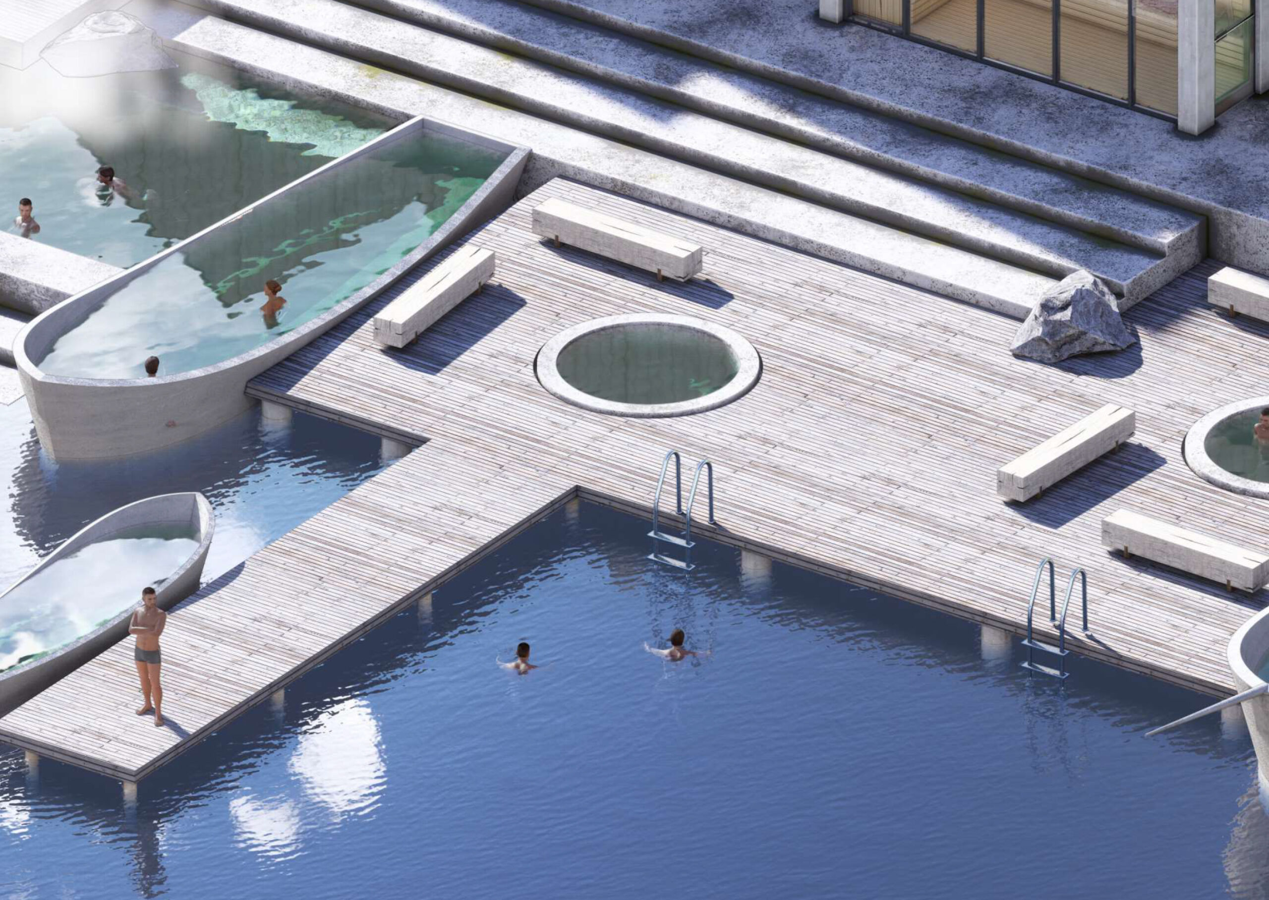 Uppbyggingin felst í því að í sandvíkurfjöru verða byggð upp ný og stærri Fjöruböð vestan við núverandi potta þar sem andi þeirra heldur sér með sterkri tengingu við hafið, fjöruna, sjósókn og siglingamenningu. Fjöruböðin eru baðaðstaða fyrir alla þar sem gestir baða sig í pottum sem líkjast bátum fyrri tíða. Pottarnir hafa misheitt hitastig og eru annaðhvort ferskvatns- eða saltvatnspottar. Aðstaðan við Fjöruböðin er hönnuð með tilvísun til eldri verbúða og íslensku burstabæjanna og hefur sex burstir. Þar má finna gufubað alveg niðri í fjöruborðinu með útsýni inn Eyjafjörð, búningsherbergi og sturtur fyrir öll, heilsulind og veitingasvæði þar sem bæði má njóta veitinga innan dyra eða í sérstakri laug með útibar framan við veitingaaðstöðuna. Timburbryggja úr harðvið myndar svo gólfið á milli lauganna og skapar notalegt íverurými fyrir gesti Fjörubaðanna.