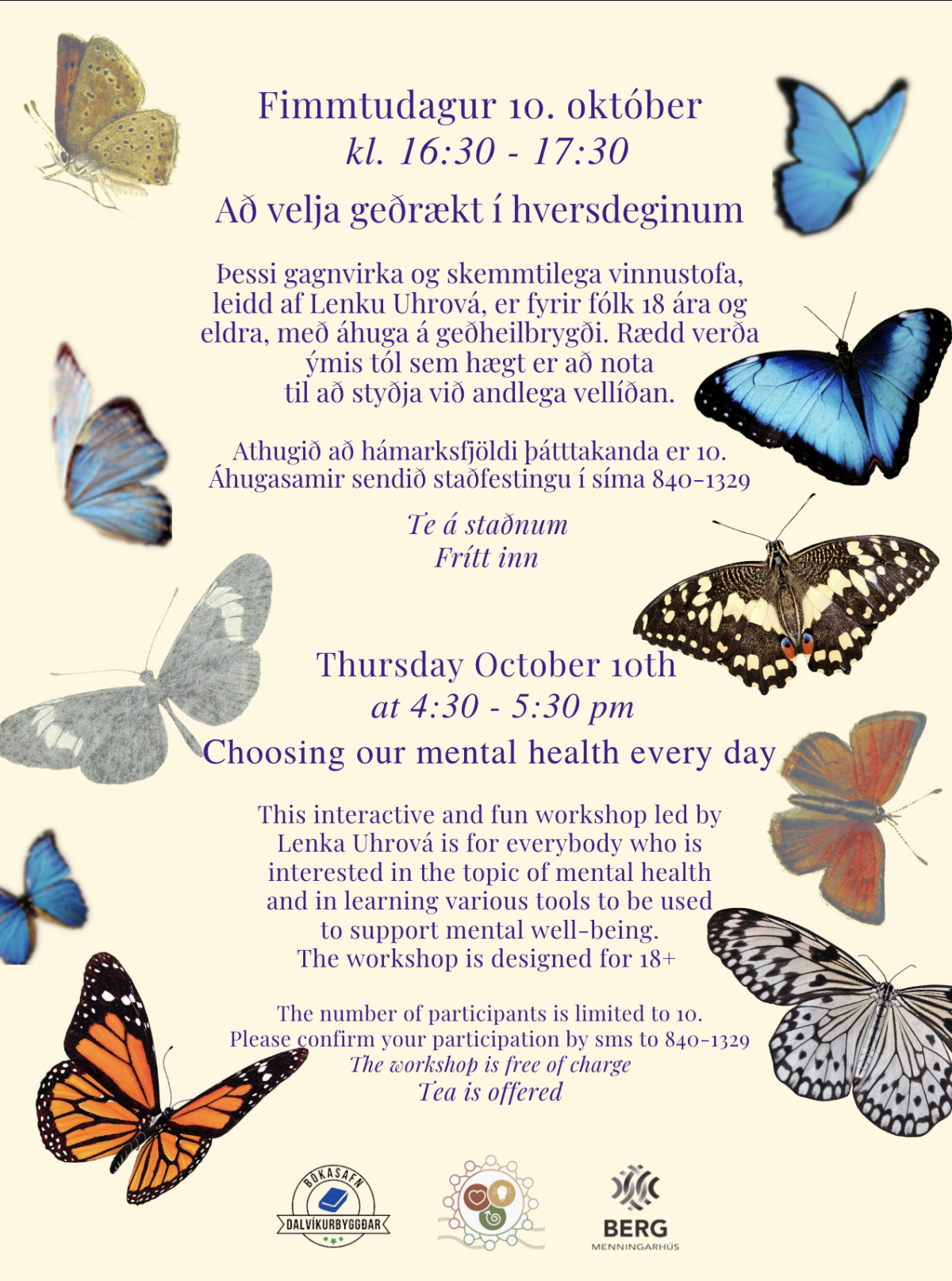 Stutt og skemmtileg gagnvirk smiðja með Lenku Uhrová, þar sem rætt verður um að velja geðrækt og nytsamleg tól sem geta nýst til þess í hversdeginum. Komið með börnin með ykkur ef þarf, smiðjan er hannað í kringum fjölskyldur og sem öruggt rými. Te á staðnum. Mikivægt er að staðfesta þátttöku sína þar sem hámarksfjöldi þátttakenda eru 10 manns! staðfestið í síma: 840-1329
