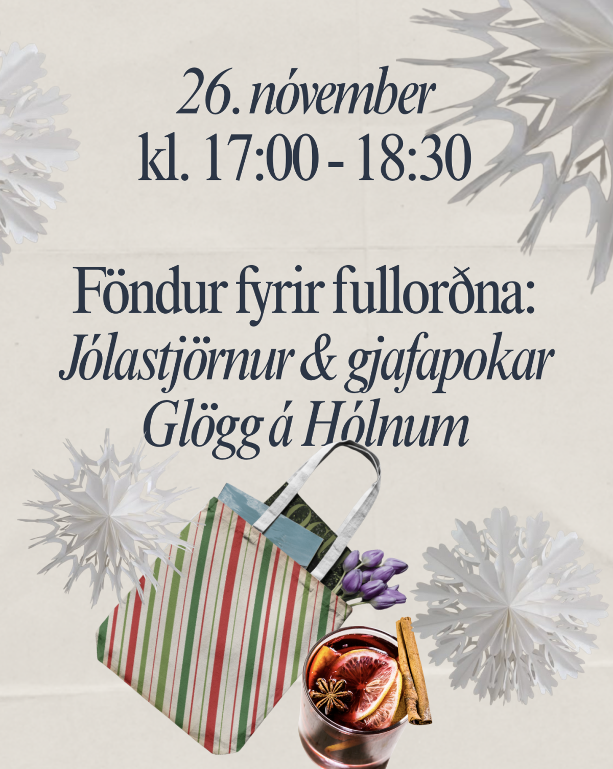 Viðburður hugsaður fyrir fullorðna, þó föndurelskandi börn séu alltaf velkomin. Þá ætlum við að föndra stórar pappírsstjörnur sem sæma sér vel í upplýstum gluggum. Einnig munum við sauma jólagjafapoka. Gjafapoka-hluti viðburðarins er í samstarfi við Rauða Krossinn í Eyjafirði og verður efni til að sauma úr á staðnum í boði hans. Viðburðurinn lýsir Bergi vel; sjálfbærni og endurvinnsla, samvera og samvinna. Einnig verða saumavélar í boði fyrir þau sem eru keppnis. Hóllinn ætlar að laga ilmandi jólaglögg svo við munum mögulega hygge-a yfir okkur á þessum viðburði. Hver veit nema við setjum jafnvel eitthvað festívt á fóninn. (Þess má geta að Rauði Krossinn verður áfram með viðburð með svipuðu sniði í Rauða kross búðinni í Klemmunni. Fylgist endilega vel með því.)