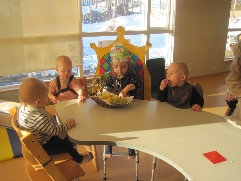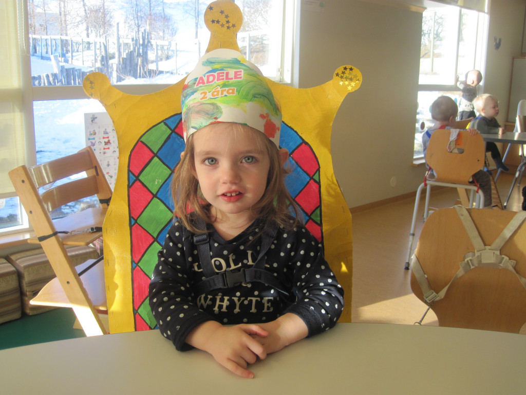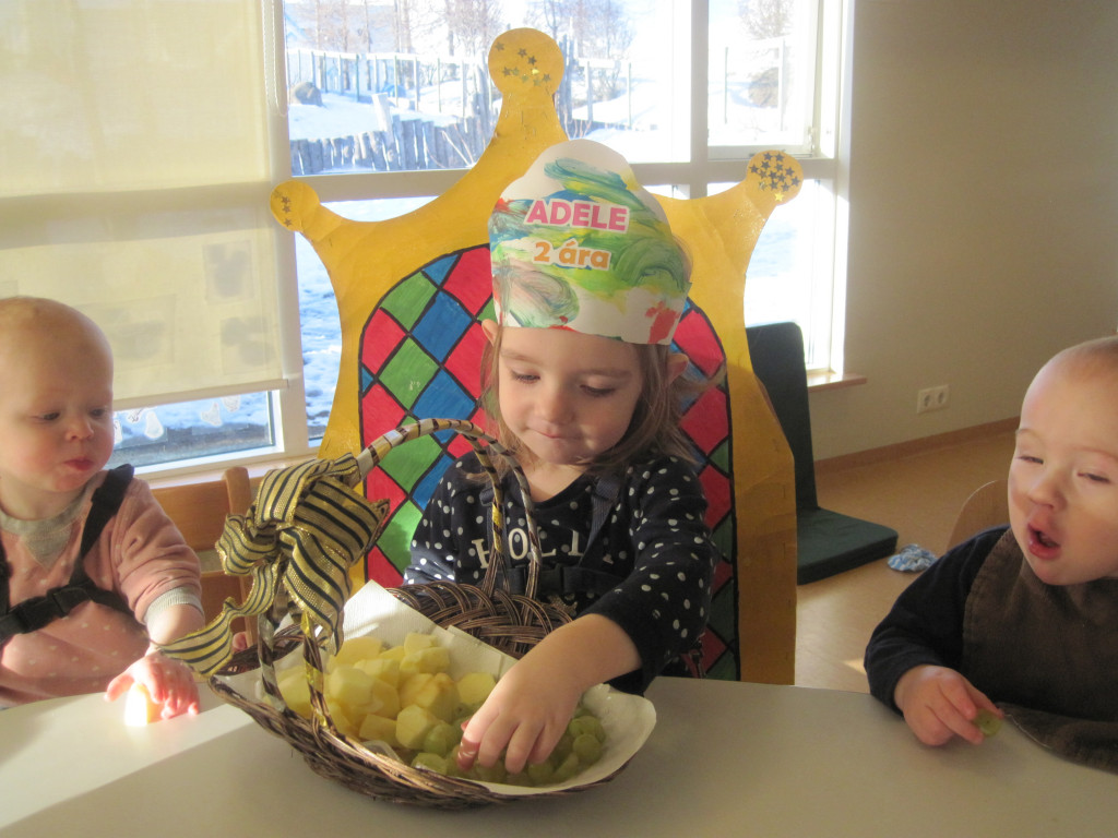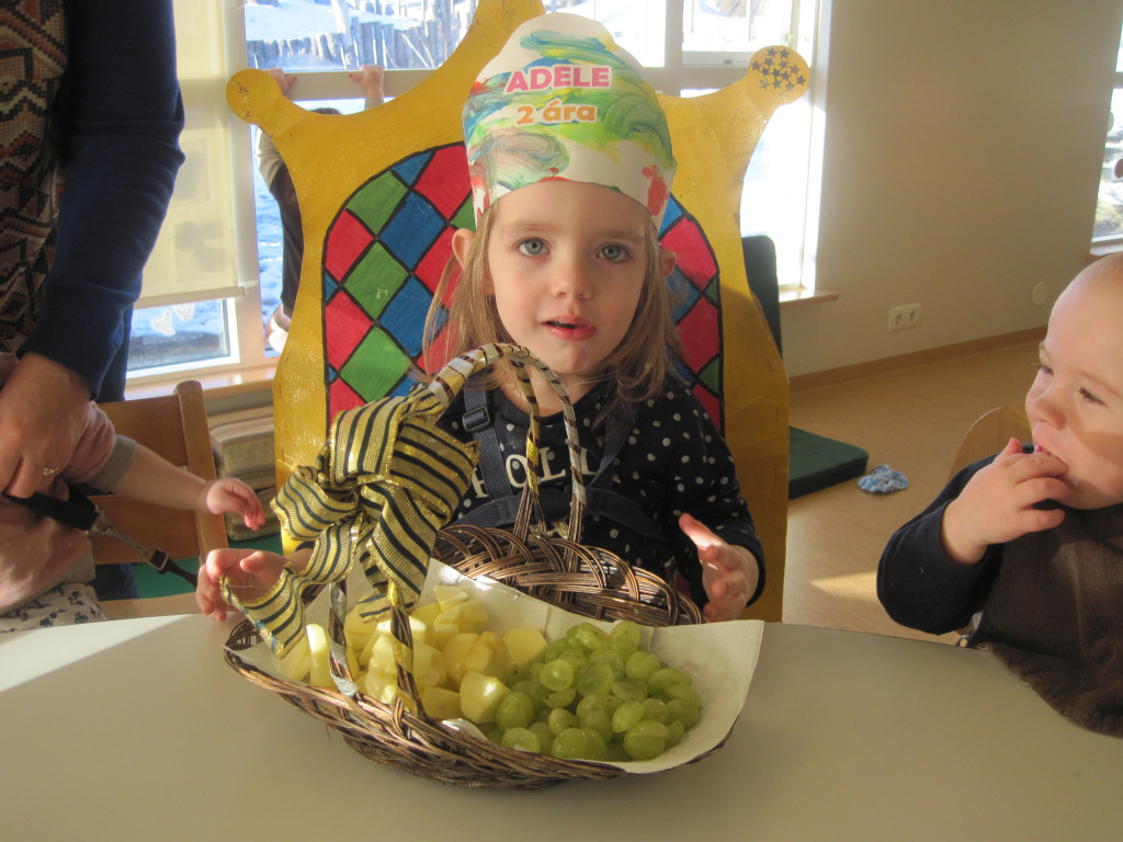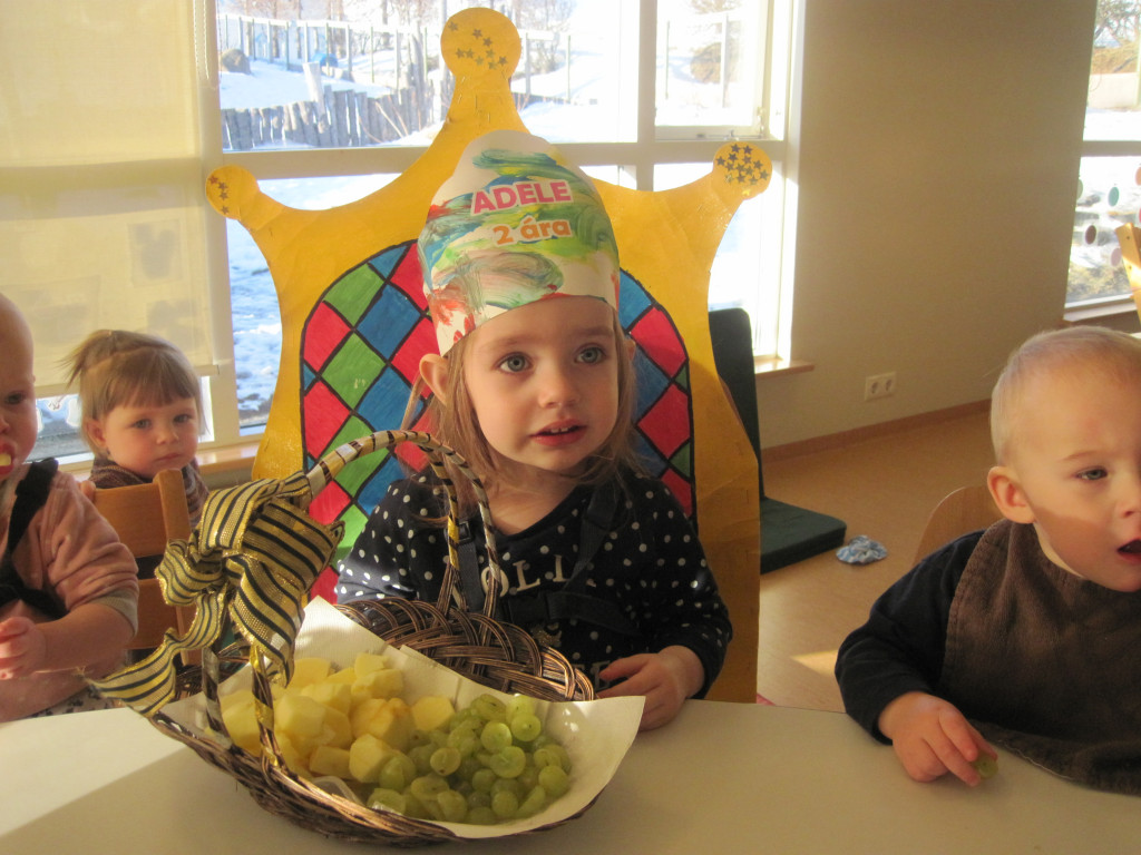 Á miðvikudaginn héldum við upp á 2 ára afmælið hennar Adele. Hún bjó til fallega kórónu og í ávaxtastundinni sungum við fyrir hana afmælissönginn, hún hefur stækkað í nótt og þetta er afmæliskveðja. Eftir sönginn fengu svo allir sér ávexti úr ávaxtakörfunni.