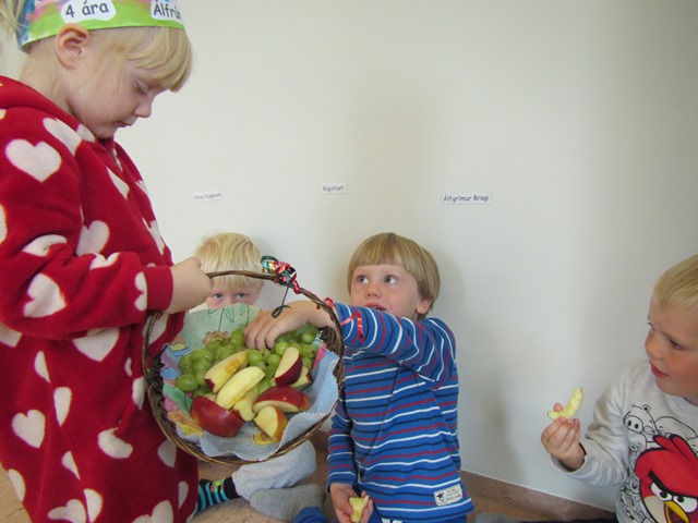 og að lokum bauð hún öllum á Kátakoti upp á ávexti úr afmæliskörfunni.
