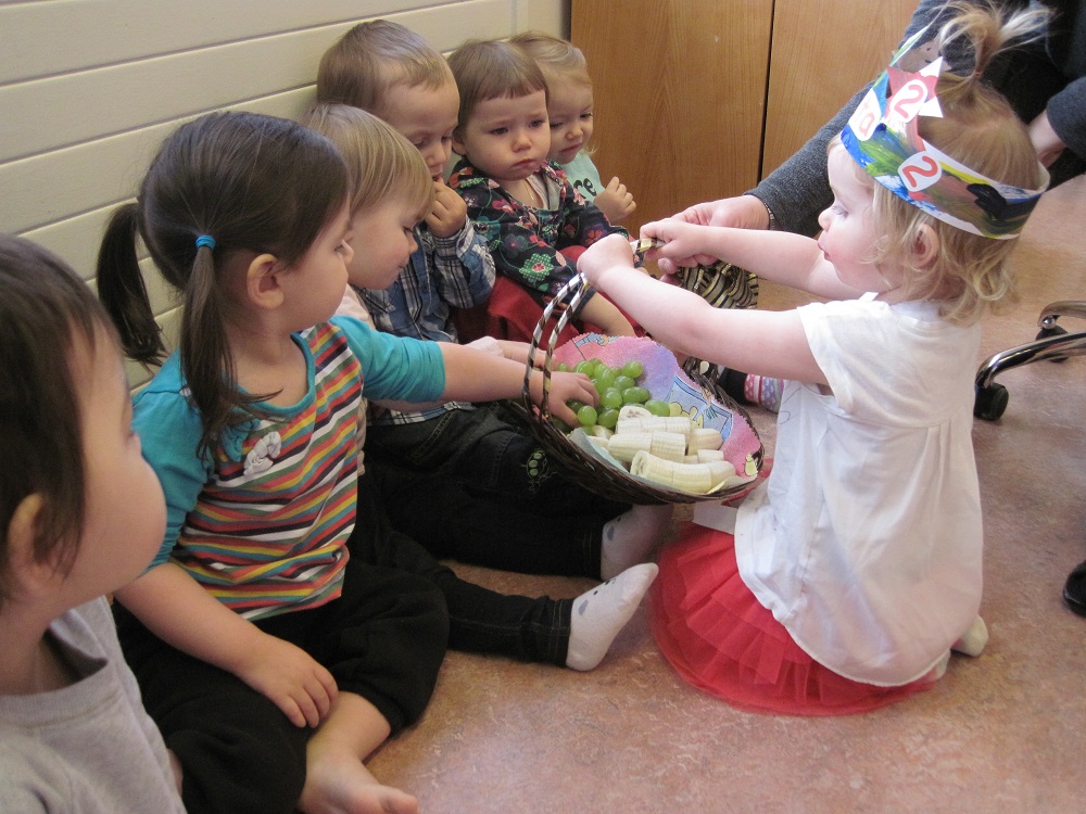 Eftir sönginn fengu sér allir ávexti úr ávaxtakörfunni.