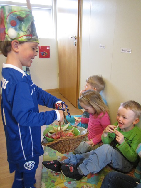 og bauð svo öllum í Mánakoti upp á ávexti úr afmæliskörfunni.