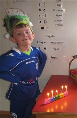 Anton Andri bjó sér til þessa fallegu kórónu, blés á kertin 5
