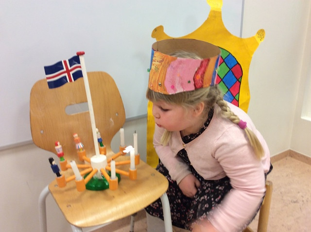 Auður Embla verður 5 ára þnn 14. nóvember. En þar sem hún verður fjarverandi á sjálfan afmælisdaginn héldum við upp á afmælið hennar í leikskólanum í dag. Hún var búin að búa sér til kórónu sem hún bar og bauð svo upp á ávexti í ávaxtastundinni, blés á kertin 5, börnin sungu fyrir hana afmælissönginn og svo flaggaði hún íslenska fánanum. Hún fékk einnig að vera umsjónarmaður dagsins. Við óskum Auði Emblu og fjölskyldu hennar innilega til hamingju með daginn.